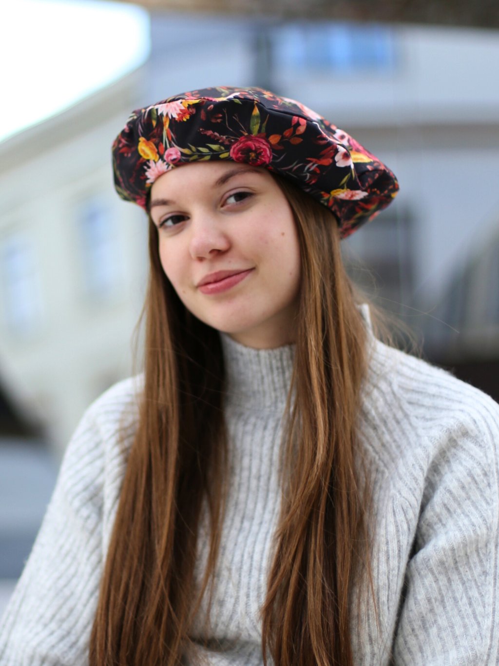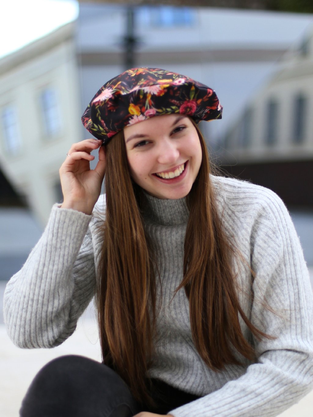 Květinkový černý baret, který má druhou stranu černou. Nechte rozkvést svůj den. :)