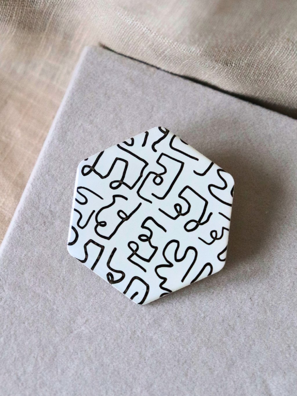 Bílá vzorovaná brož - designový tvar hexagonu z kolekce Počmáraná.