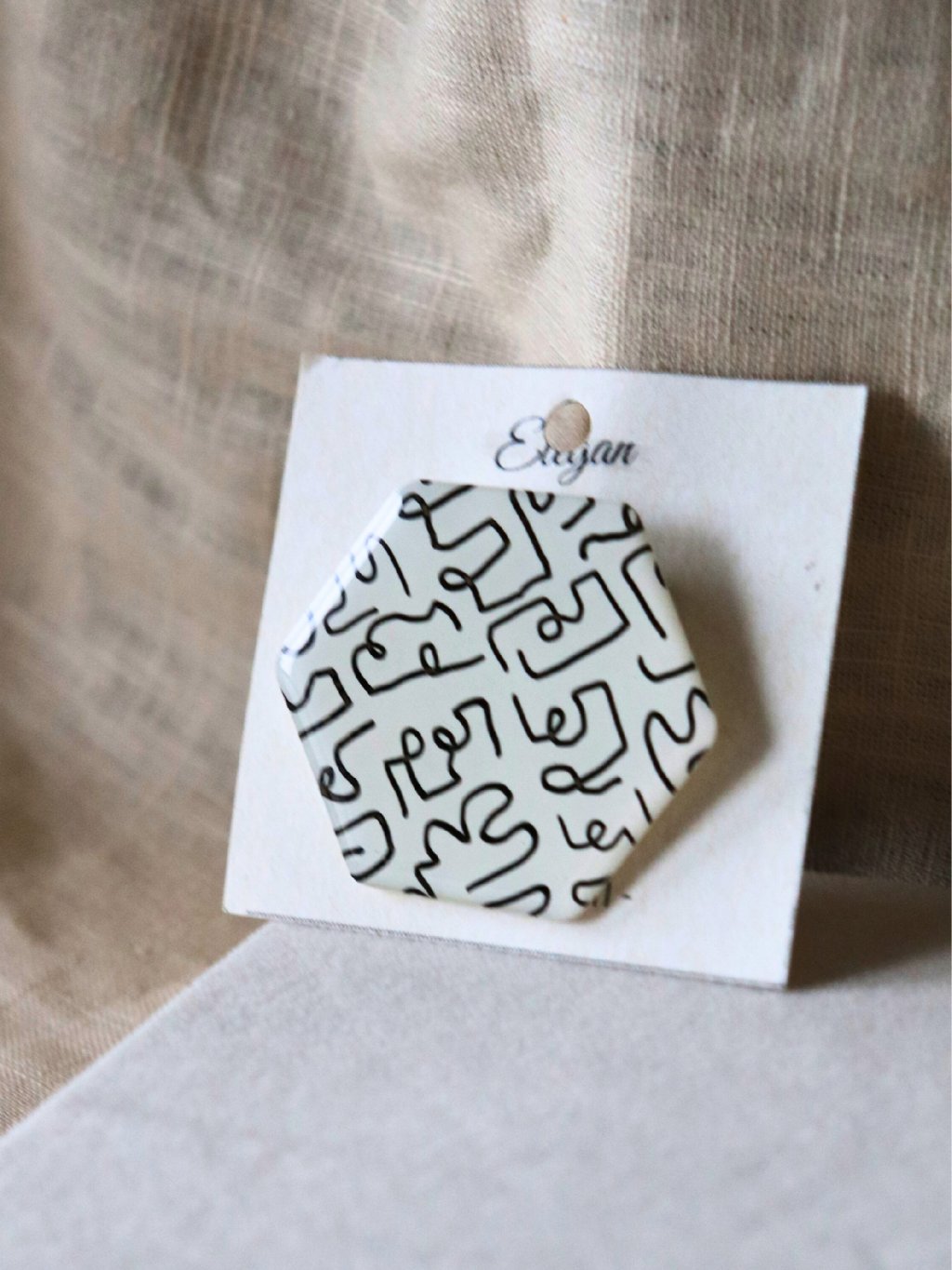 Šestiúhelníková brož neboli hexagon působí moderně a geometricky. Tento tvar přidává brožím sofistikovaný a elegantní vzhled. Brože jsou zdobeny ručně malovanými vzory. Každý vzor je jedinečný a dodává brožím umělecký nádech.