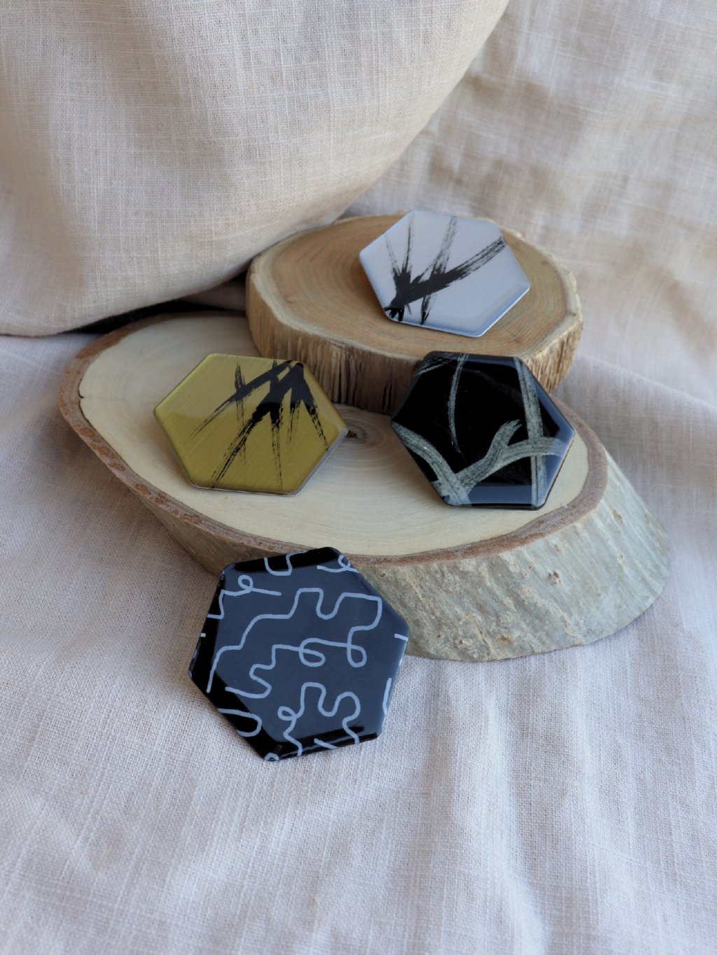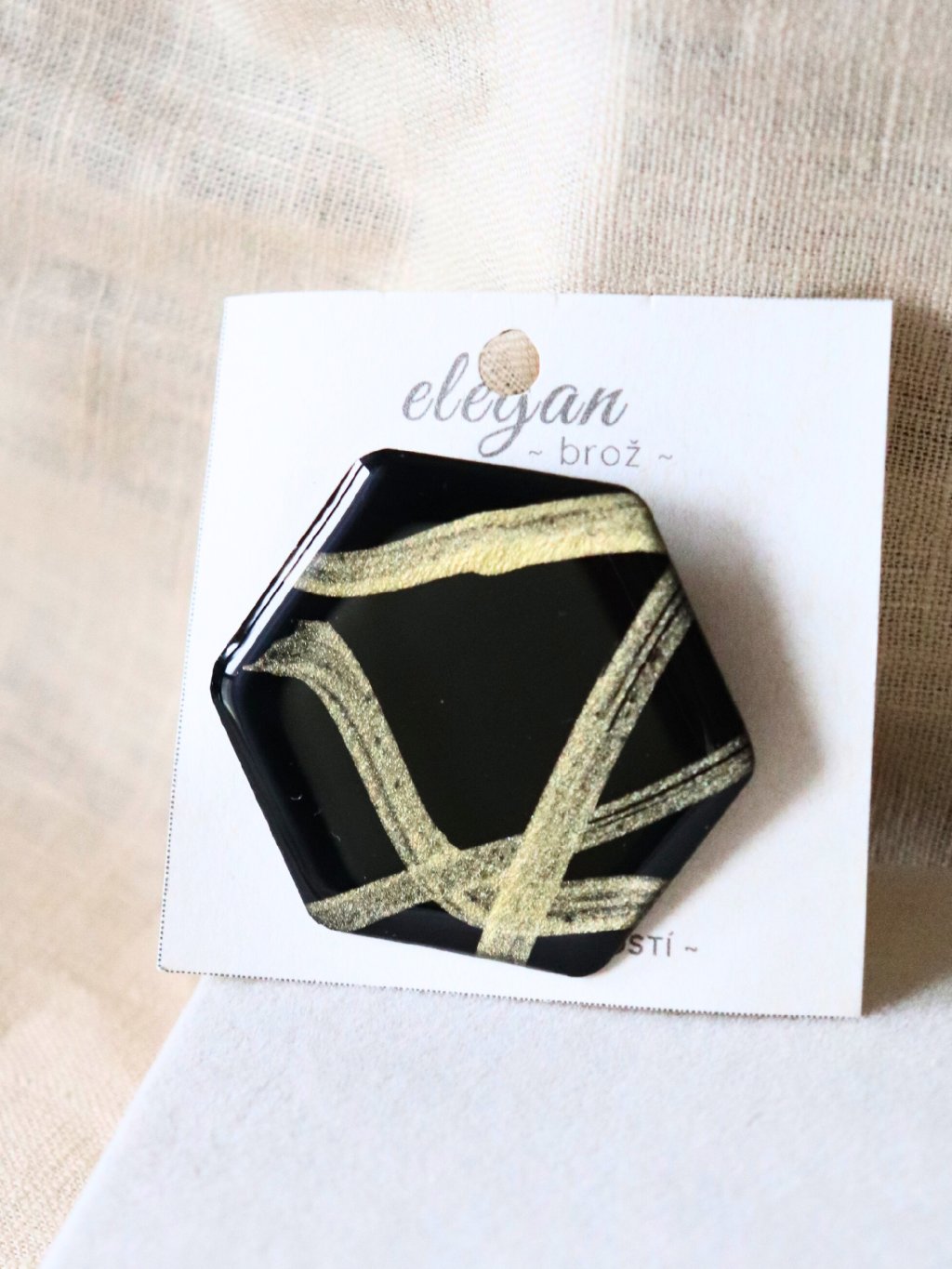 Šestiúhelníková brož neboli hexagon působí moderně a geometricky. Tento tvar přidává brožím sofistikovaný a elegantní vzhled. Brože jsou zdobeny ručně malovanými vzory. Každý vzor je jedinečný a dodává brožím umělecký nádech.