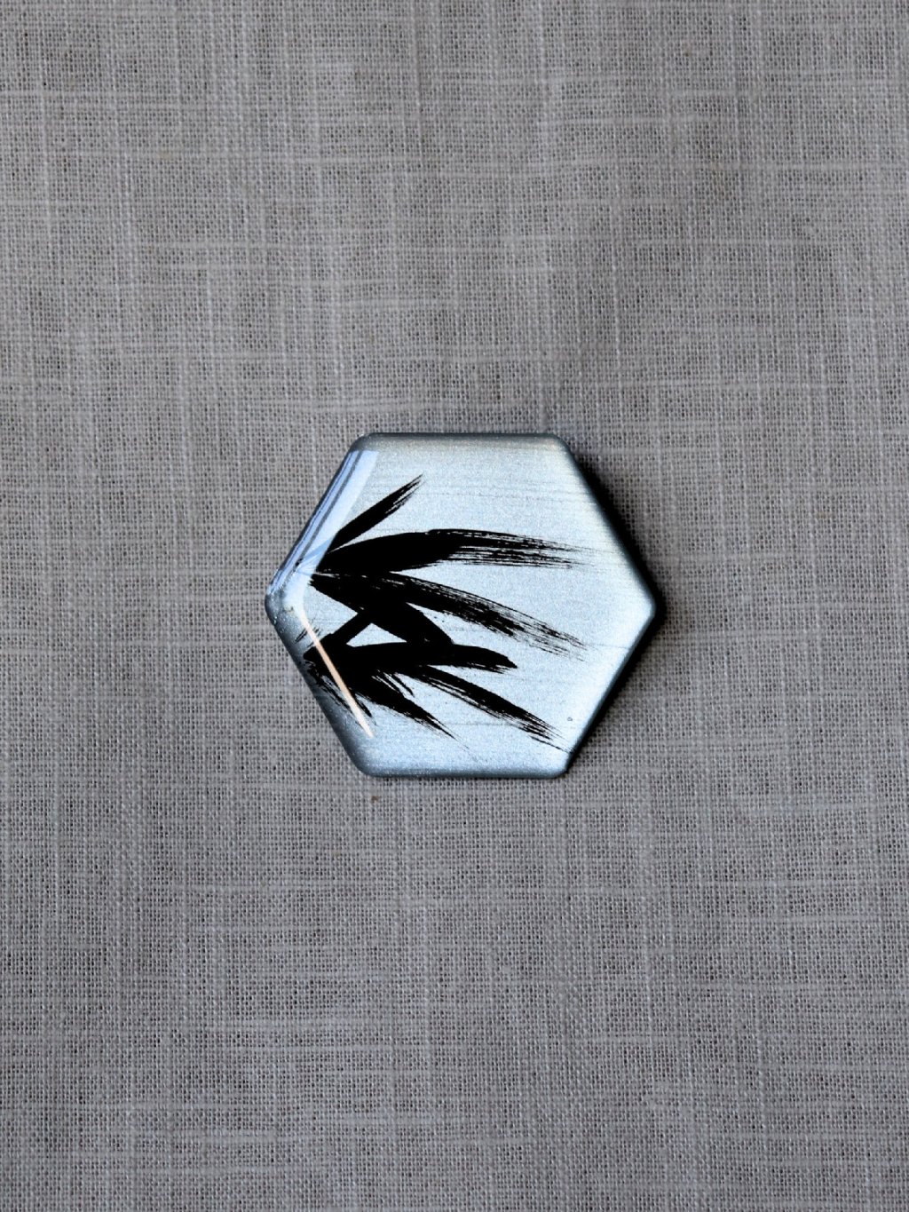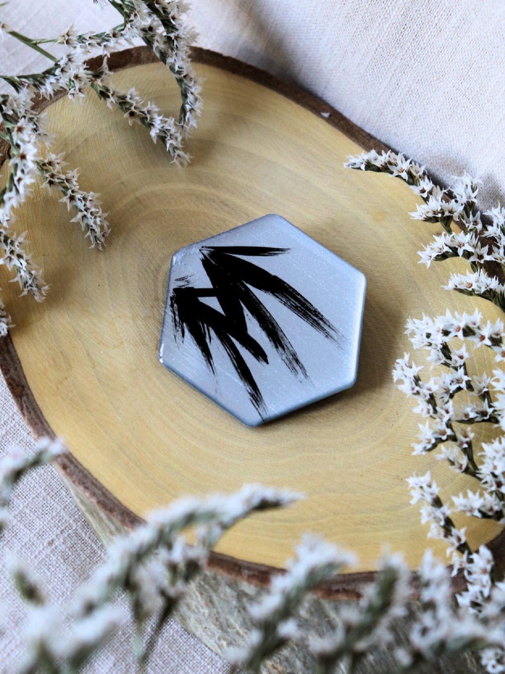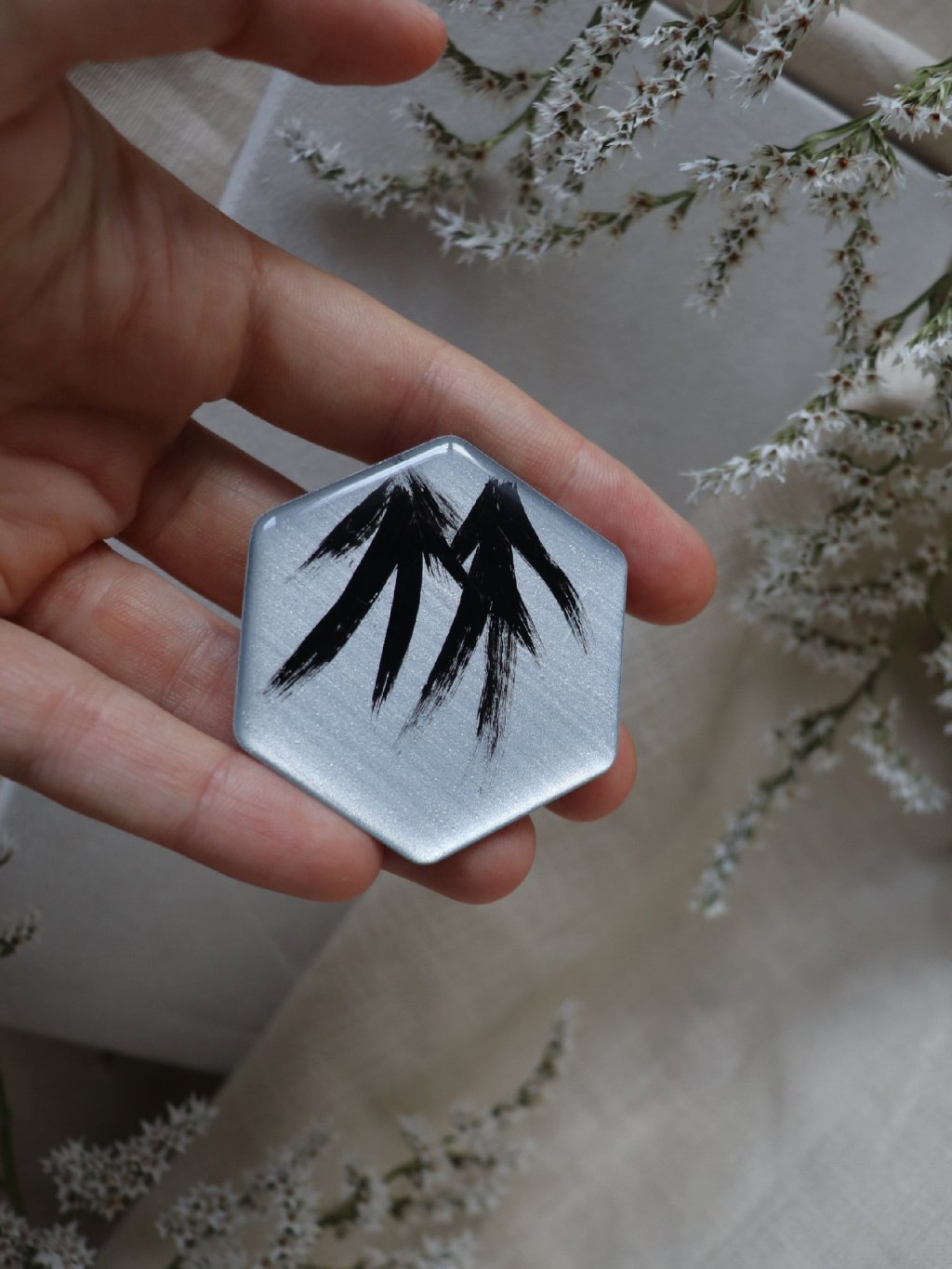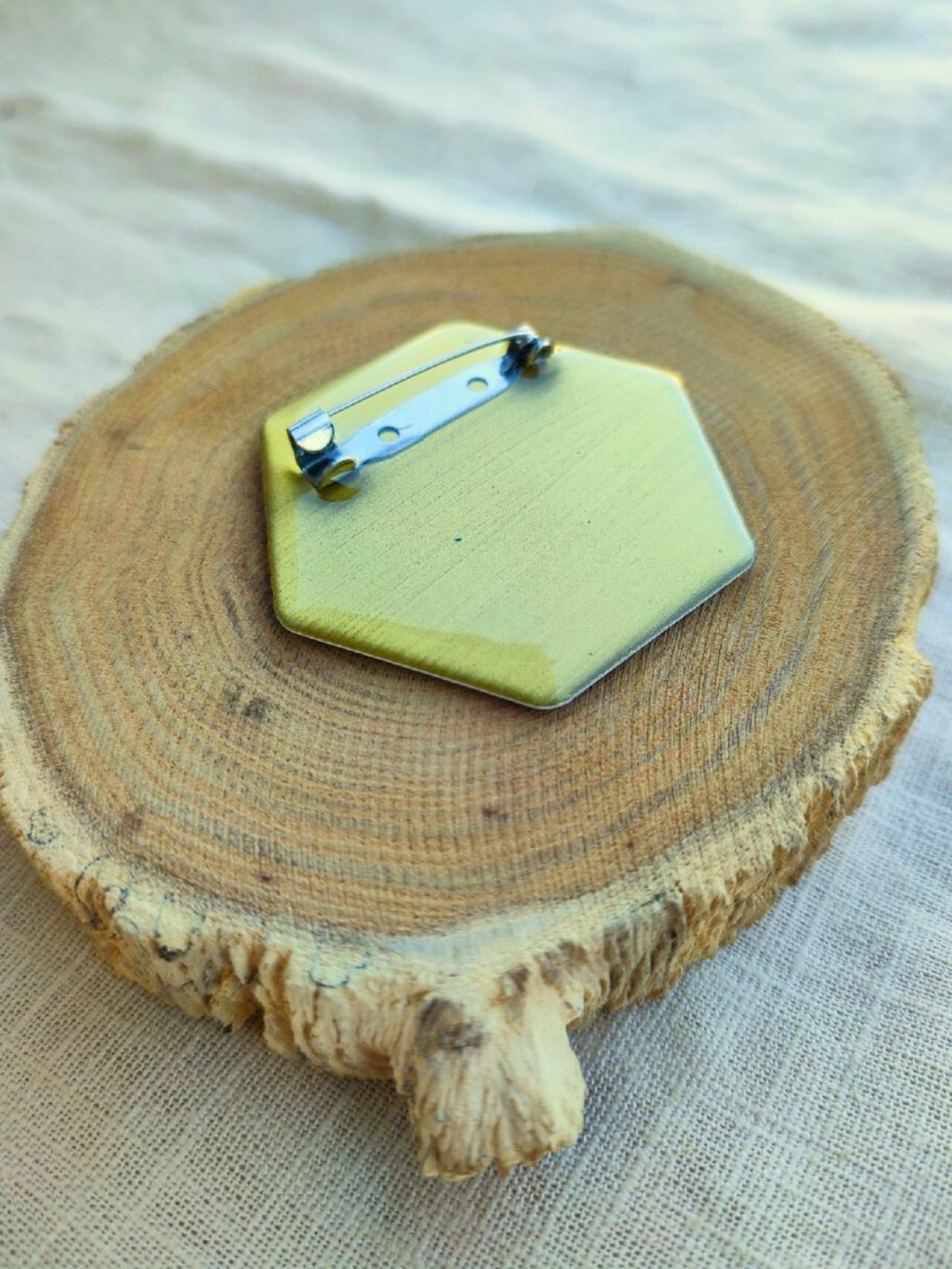 Šestiúhelníková brož neboli hexagon působí moderně a geometricky. Tento tvar přidává brožím sofistikovaný a elegantní vzhled. Brože jsou zdobeny ručně malovanými vzory. Každý vzor je jedinečný a dodává brožím umělecký nádech.