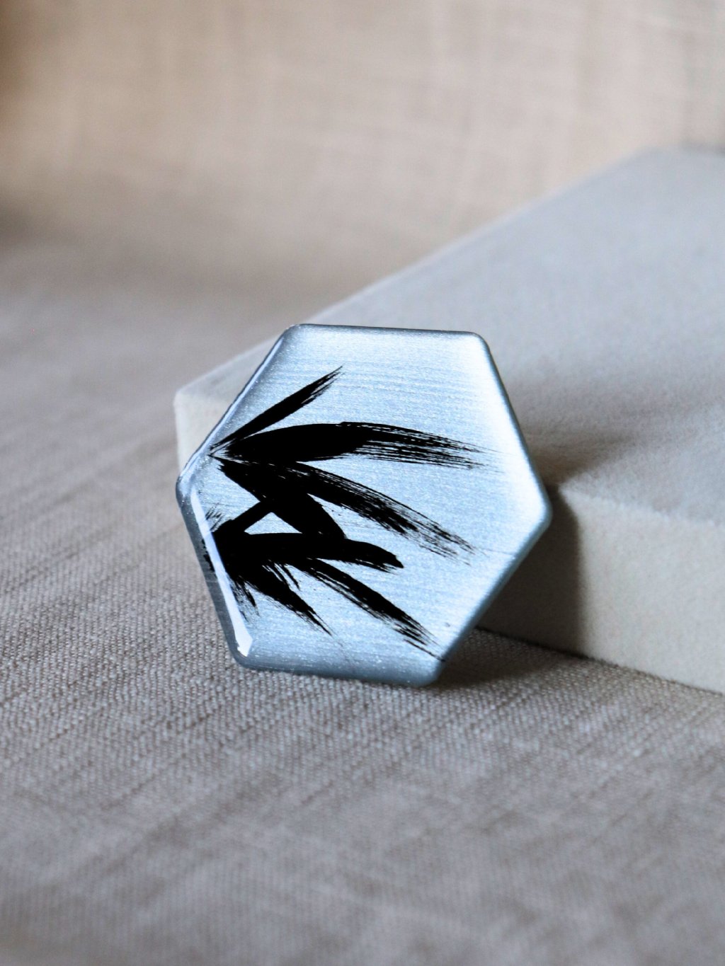 Moderní geometrická brož ve stříbrné barvě s černými tahy štětce.