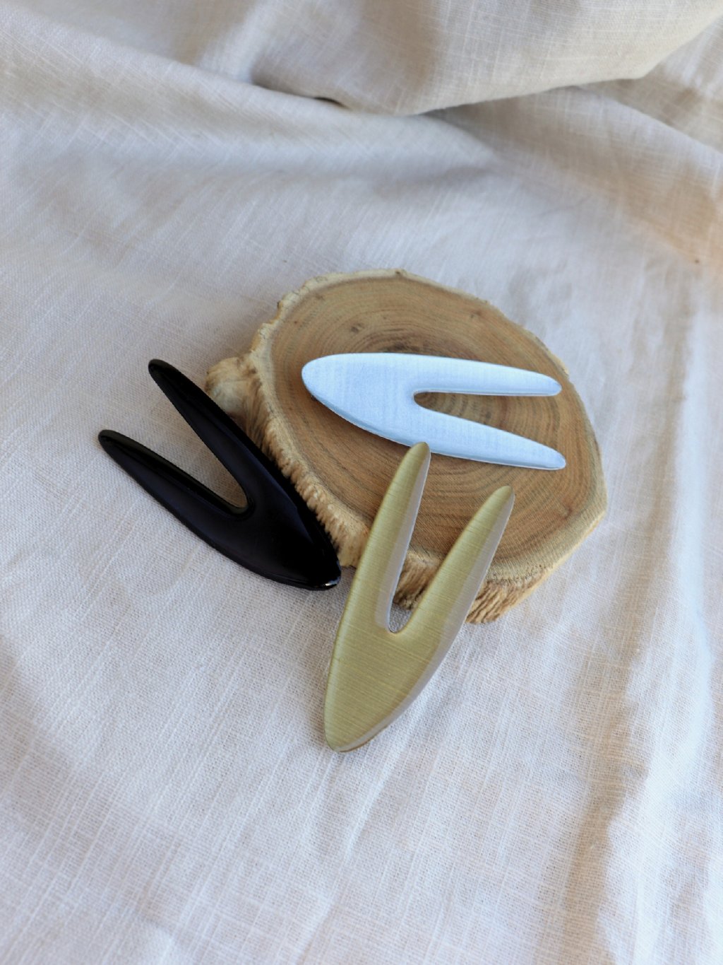 Moderní minimalistická černá brož ve tvaru véčka nebo jehlice.