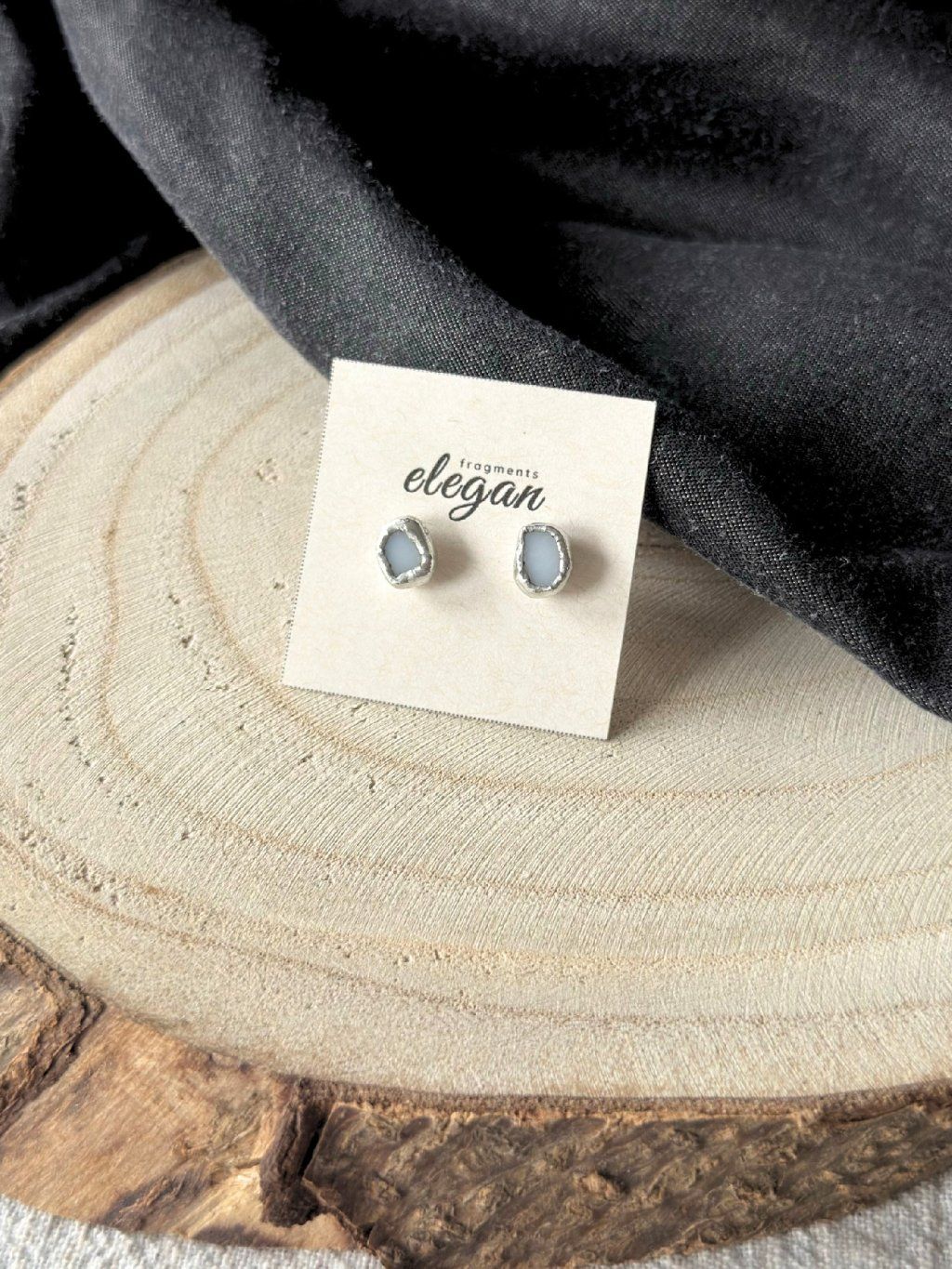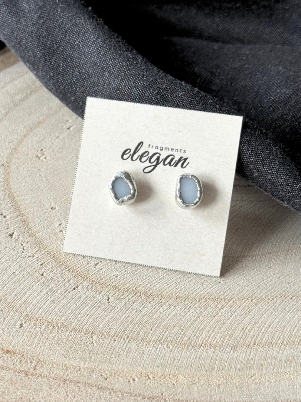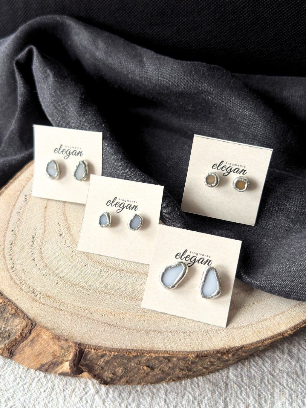Drobné náušnice z cínu ve stříbrné barvě s bílým upcyklovaným sklem a chirurgickou ocelí.