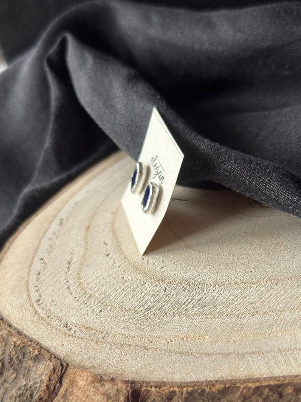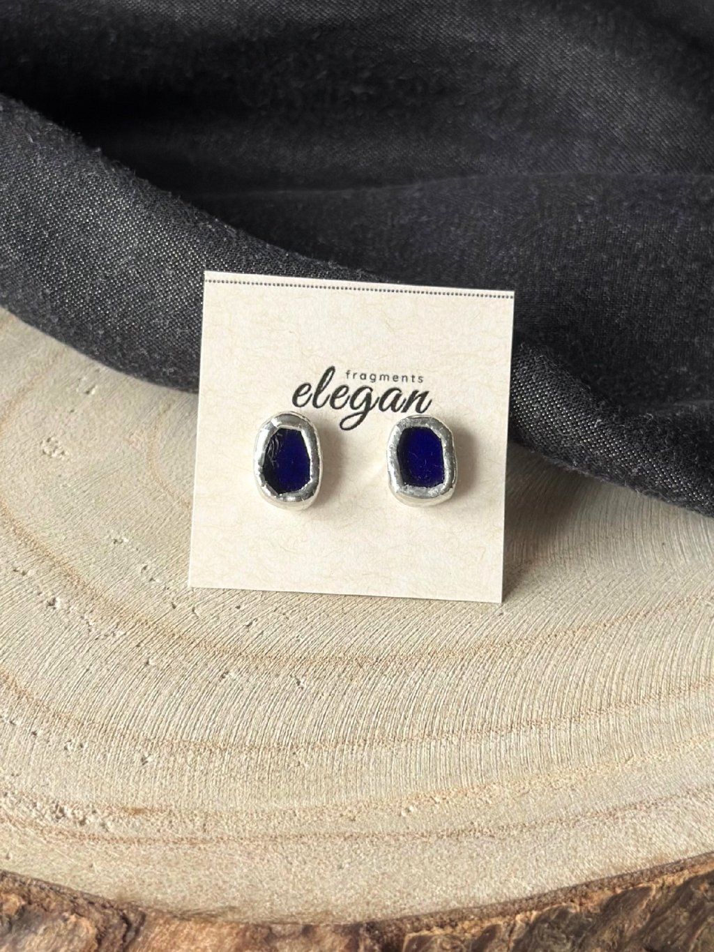 Drobné náušnice z cínu ve stříbrné barvě s modrým upcyklovaným sklem a chirurgickou ocelí.