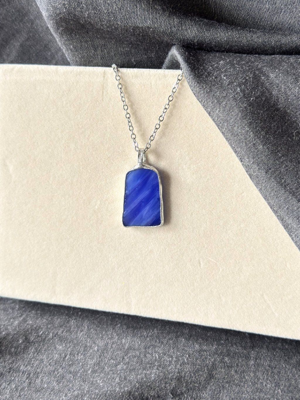 Větší přívěsek z cínu ve stříbrné a modré barvě s upcyklovaným sklem na ocelovém řetízku.