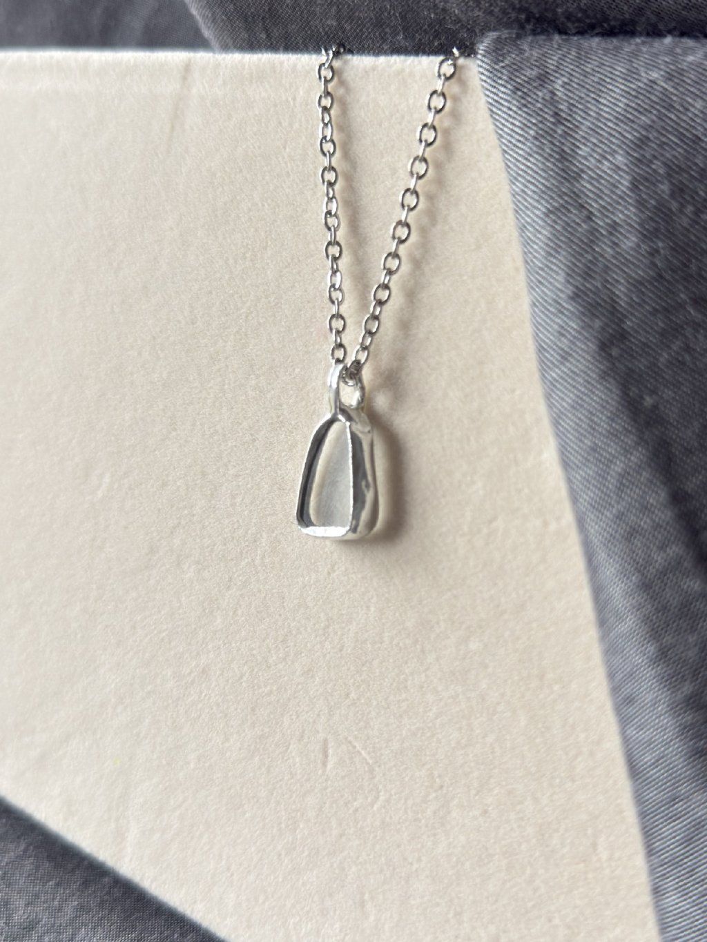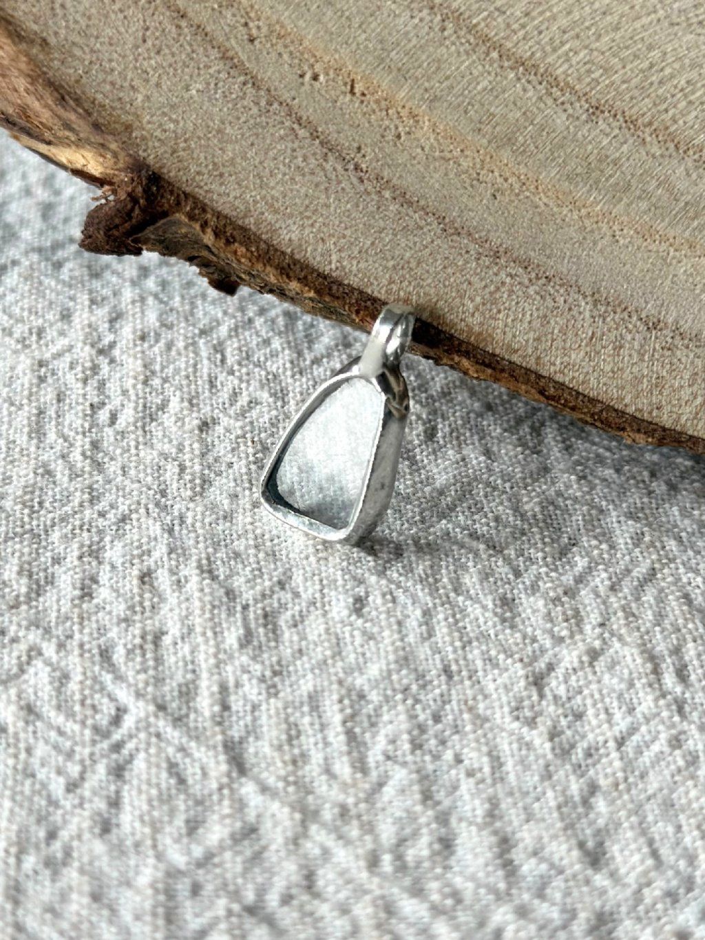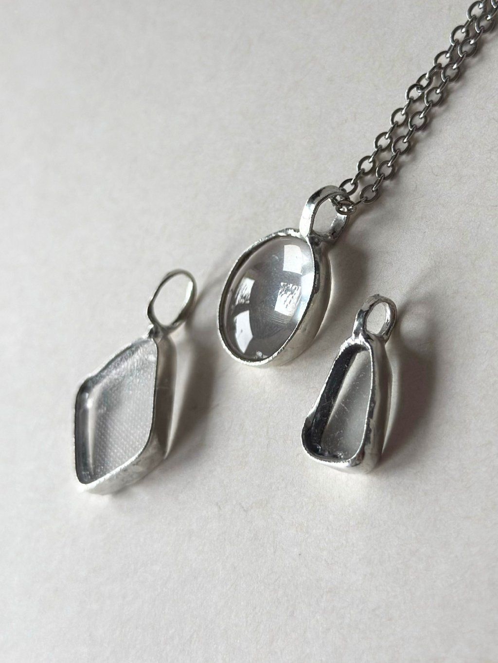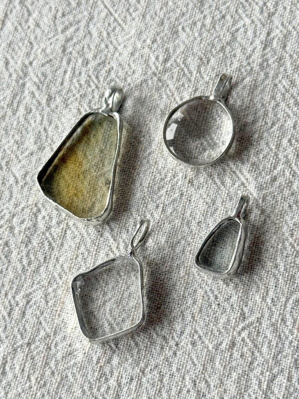 Použité sklo má svou minulost. Nese v sobě jemné nedokonalosti, struktury a odlesky, které by v novém materiálu nikdy nevznikly. Právě tyhle detaily dělají šperk tím, čím je – syrovým, autentickým a přirozeně výrazným. Cín vytváří pevný rám, který fragment drží, ale zároveň ho nechává vyniknout. Upcyklované sklo v kombinaci s cínem vytváří jedinečné artefakty na pomezí šperku a relikvie.