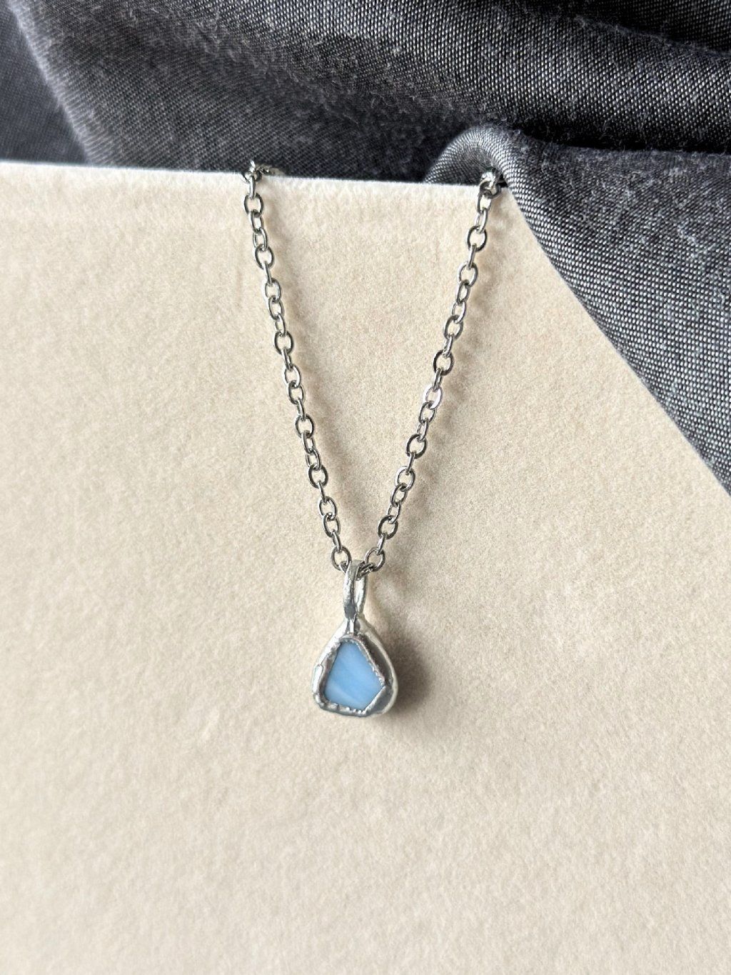 Jemný přívěsek z cínu ve stříbrné barvě s bledě modrým upcyklovaným sklem na ocelovém řetízku.