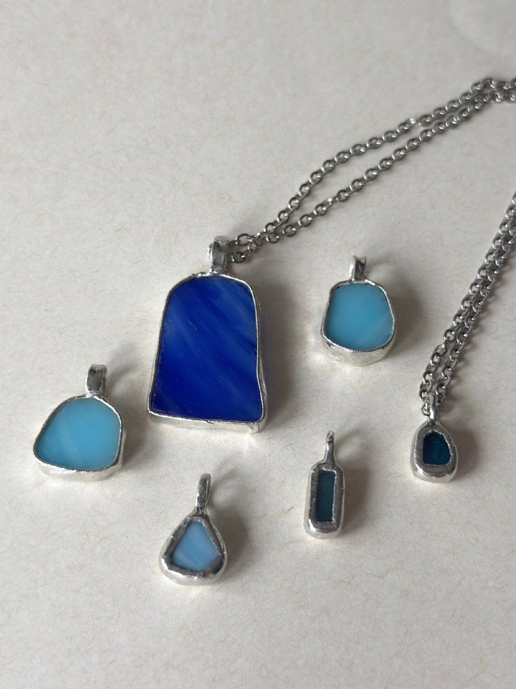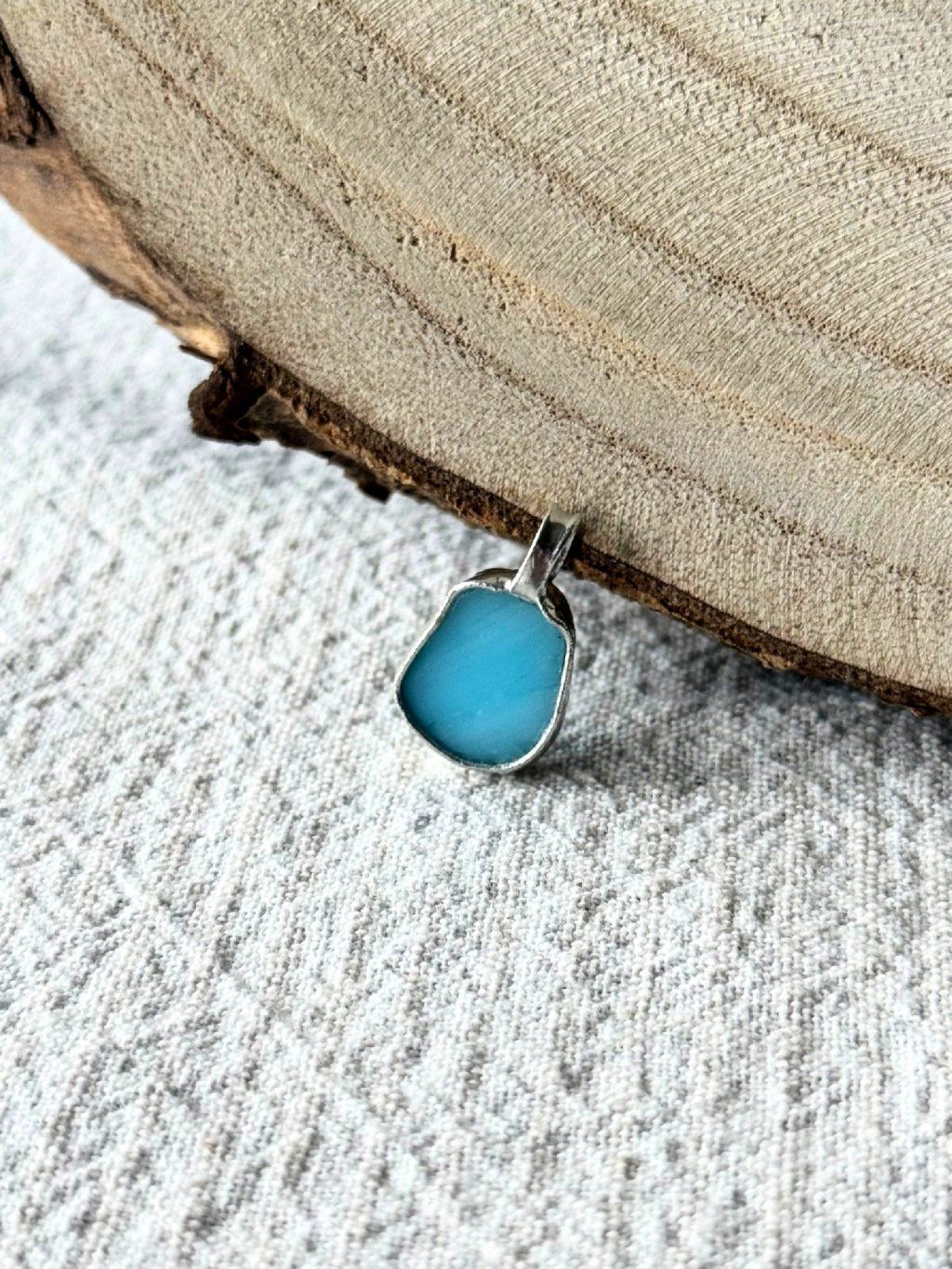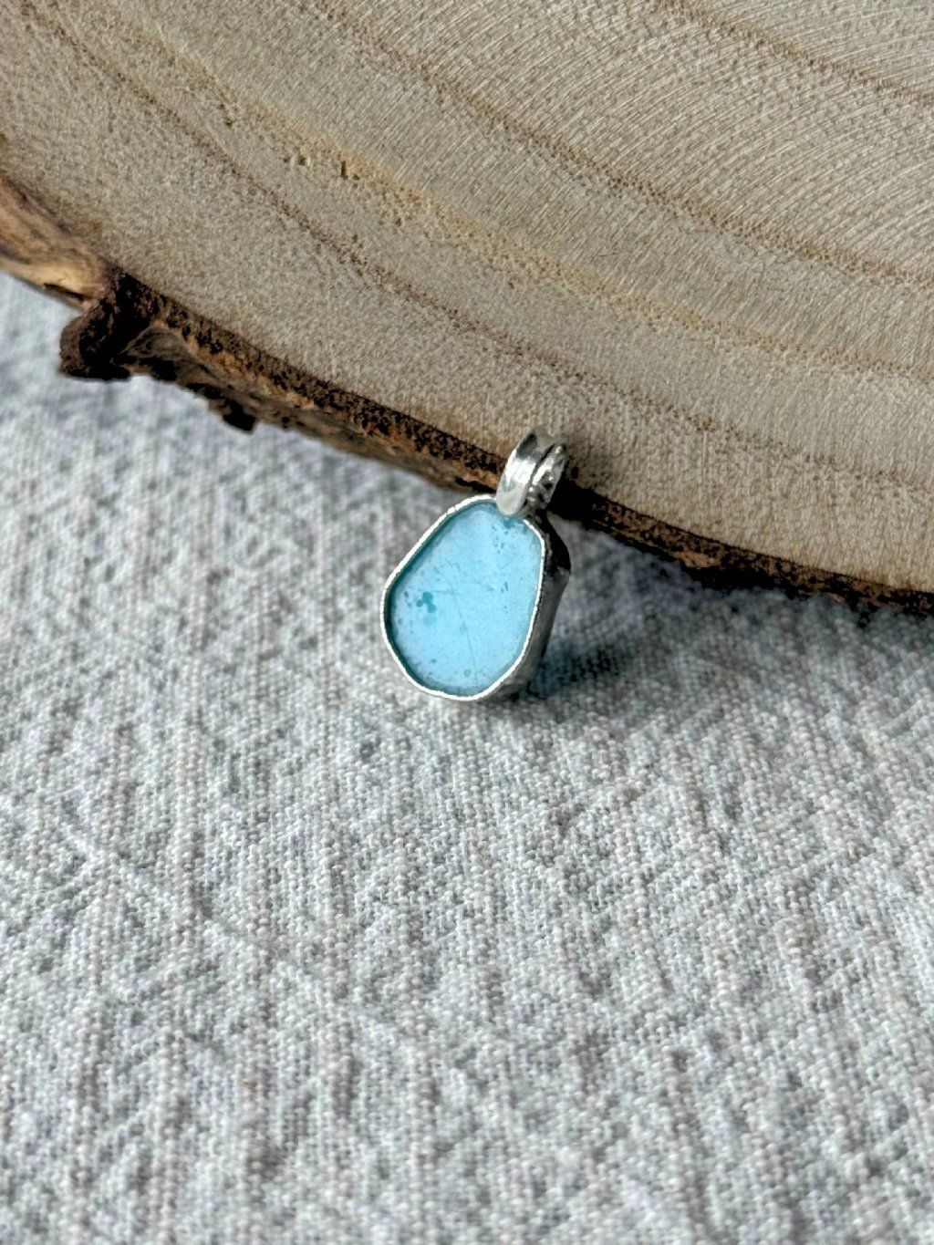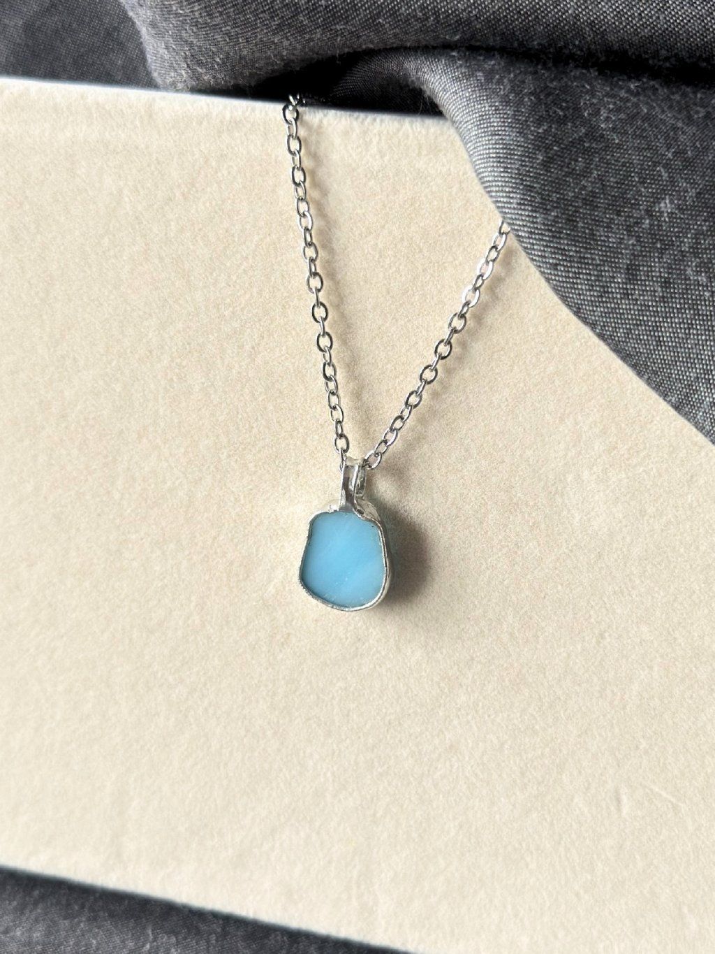 Jemný přívěsek z cínu ve stříbrné barvě se světle modrým upcyklovaným sklem na ocelovém řetízku.