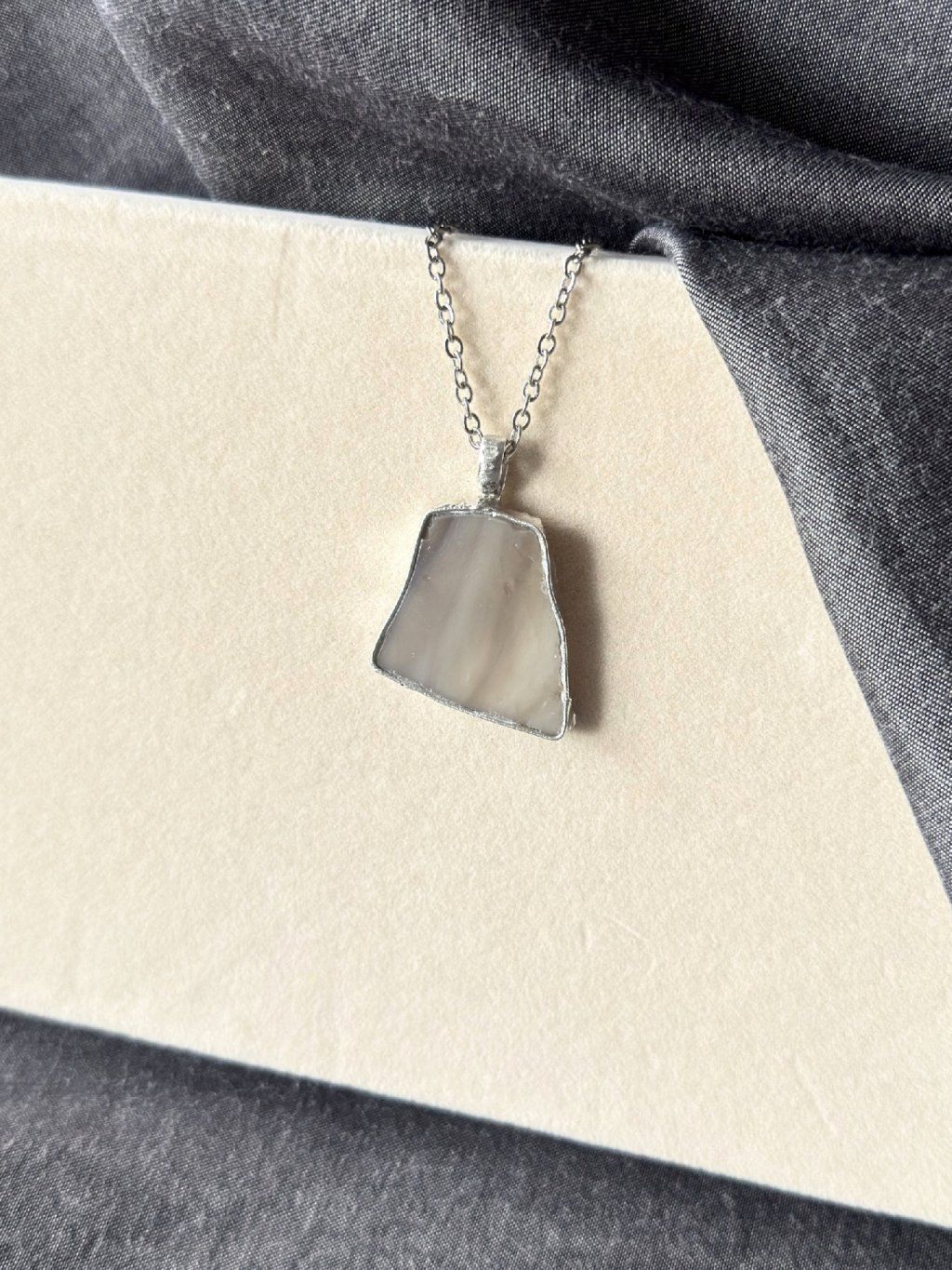 Velký béžový přívěsek ze skla a z cínu ve stříbrné barvě na ocelovém řetízku.