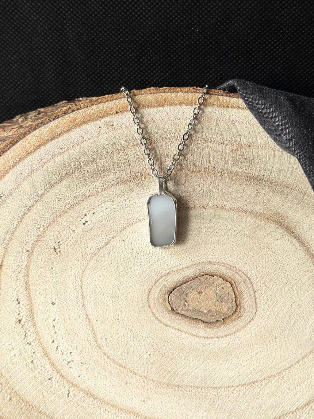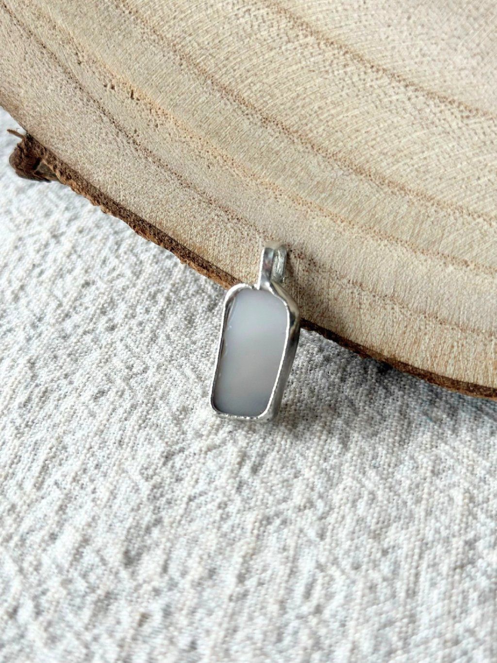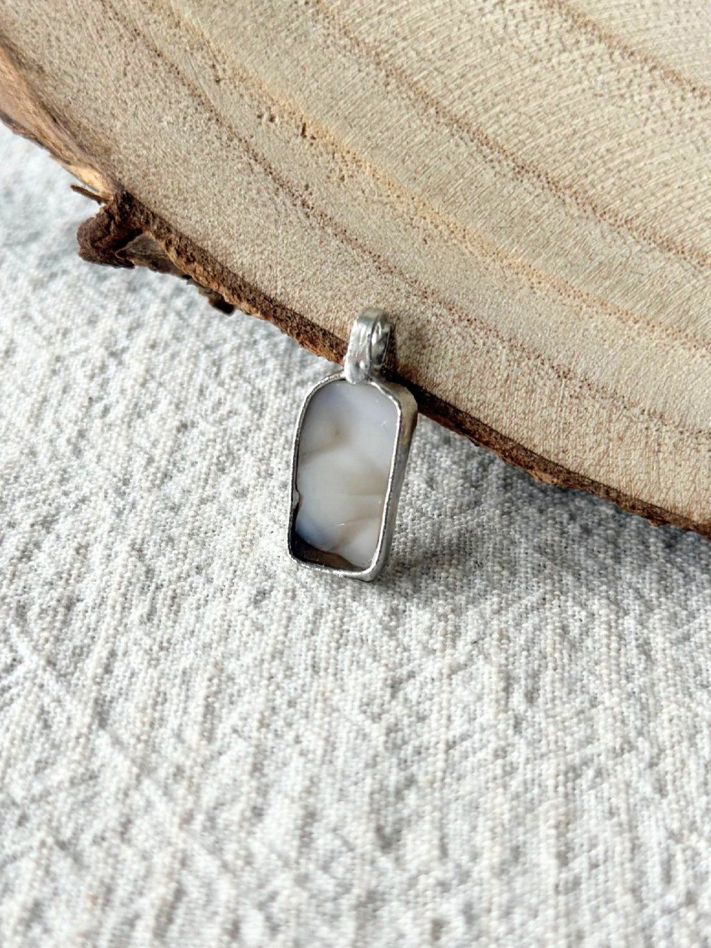 Žíhaný bílý přívěsek ze skla a z cínu ve stříbrné barvě na ocelovém řetízku.