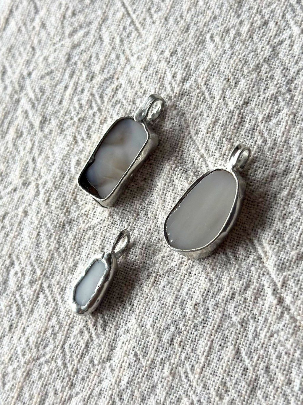 Použité sklo má svou minulost. Nese v sobě jemné nedokonalosti, struktury a odlesky, které by v novém materiálu nikdy nevznikly. Právě tyhle detaily dělají šperk tím, čím je – syrovým, autentickým a přirozeně výrazným. Cín vytváří pevný rám, který fragment drží, ale zároveň ho nechává vyniknout. Upcyklované sklo v kombinaci s cínem vytváří jedinečné artefakty na pomezí šperku a relikvie.