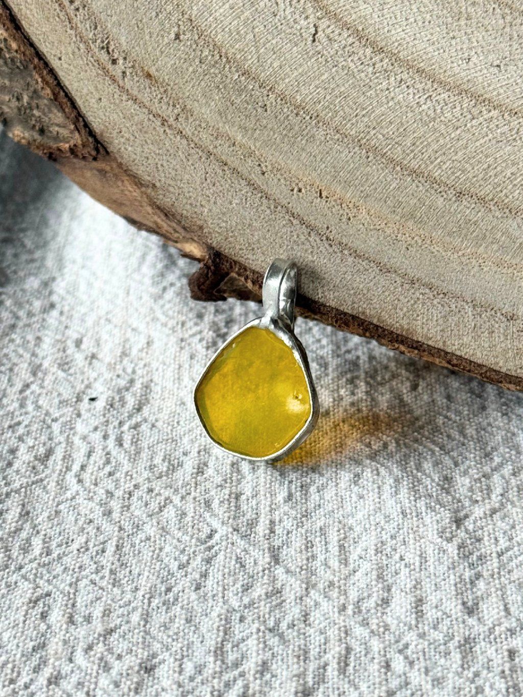 Jemný přívěsek z cínu ve stříbrné a žluté barvě s upcyklovaným sklem na ocelovém řetízku.