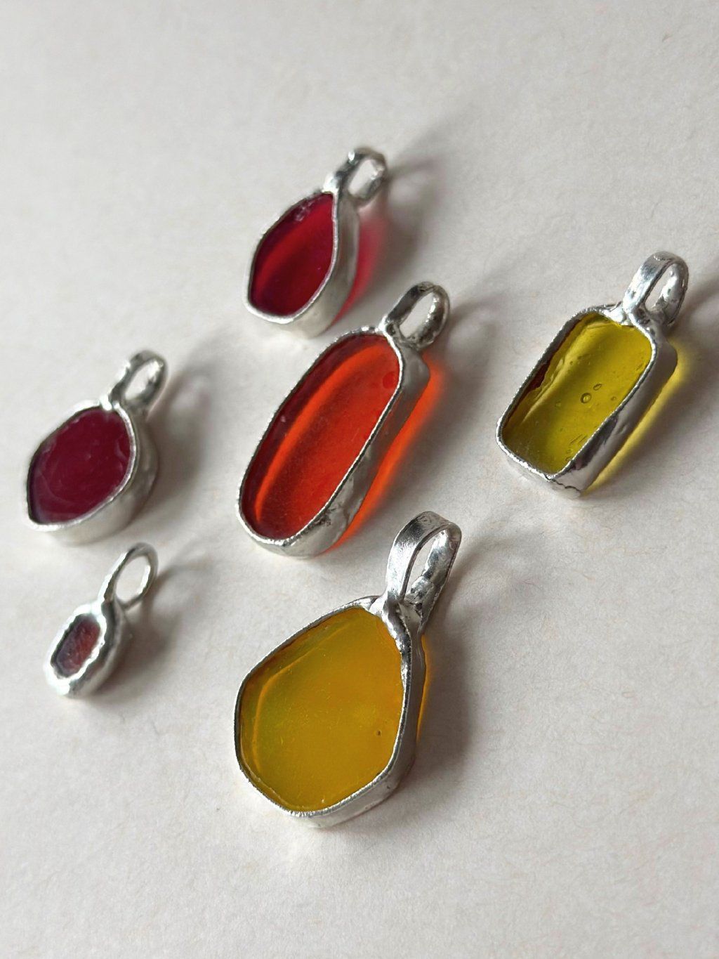 Použité sklo má svou minulost. Nese v sobě jemné nedokonalosti, struktury a odlesky, které by v novém materiálu nikdy nevznikly. Právě tyhle detaily dělají šperk tím, čím je – syrovým, autentickým a přirozeně výrazným. Cín vytváří pevný rám, který fragment drží, ale zároveň ho nechává vyniknout. Upcyklované sklo v kombinaci s cínem vytváří jedinečné artefakty na pomezí šperku a relikvie.