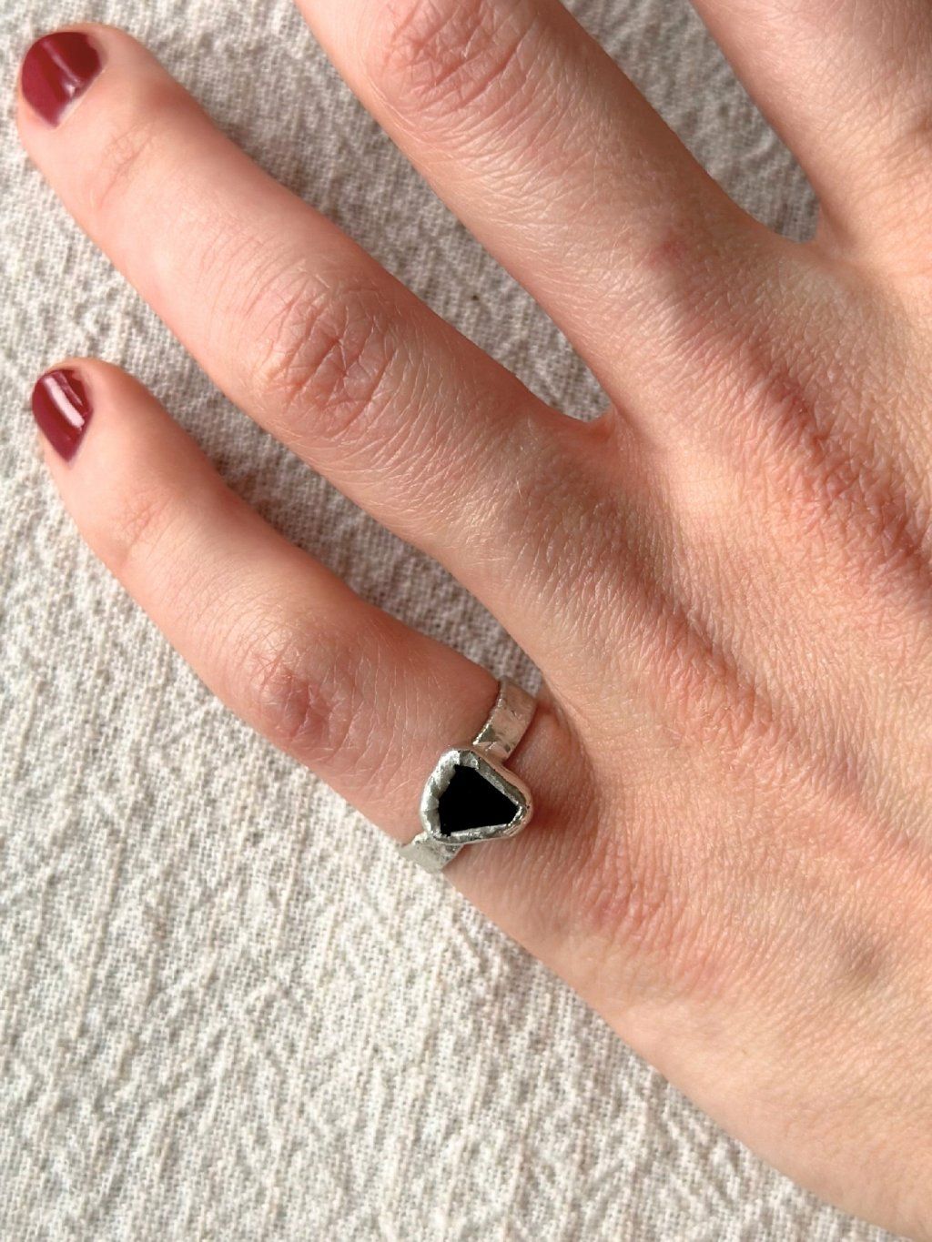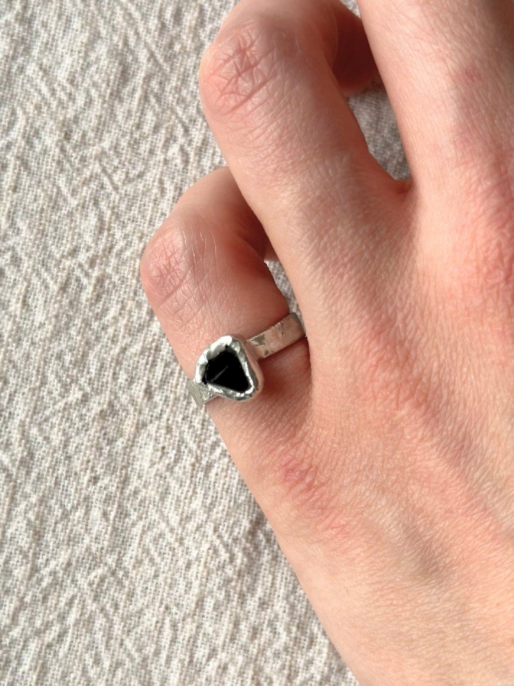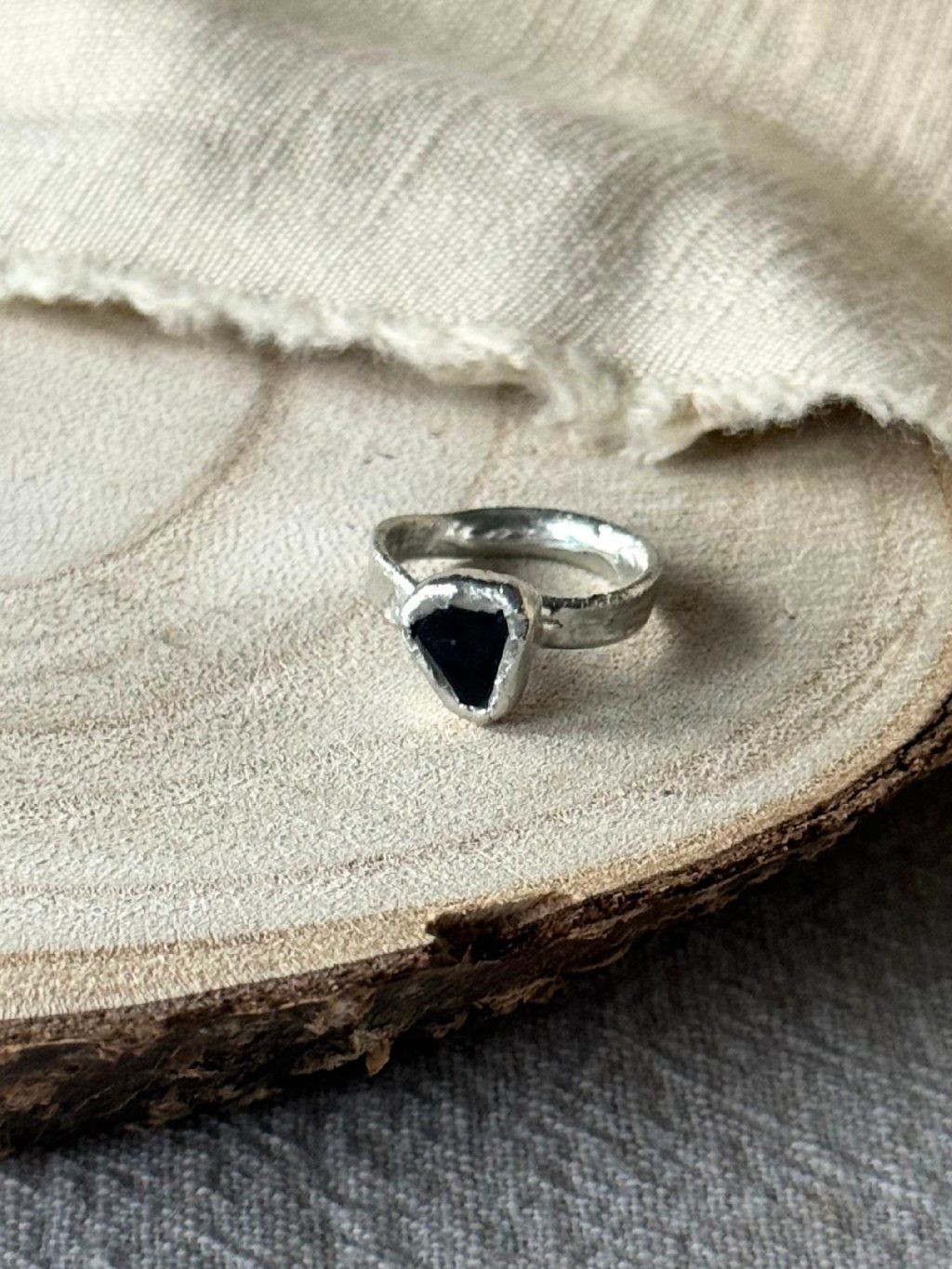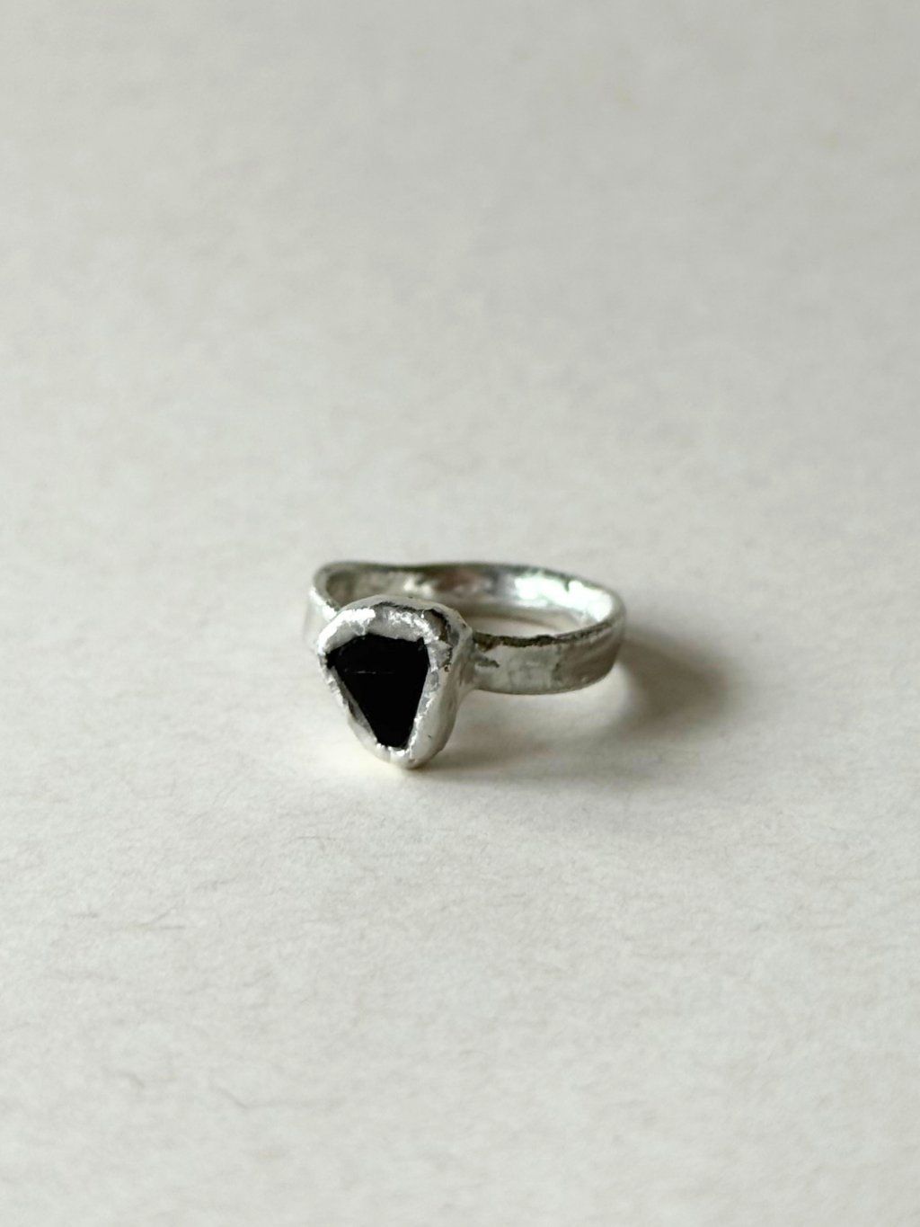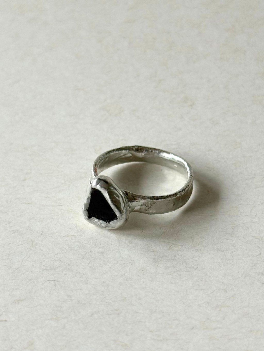 Jedinečný cínový trojúhelníkový prsten s černým sklíčkem.