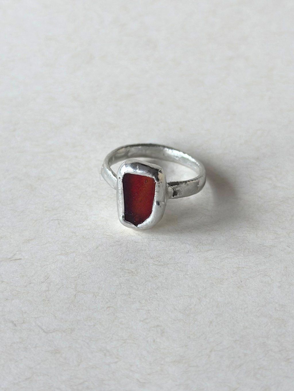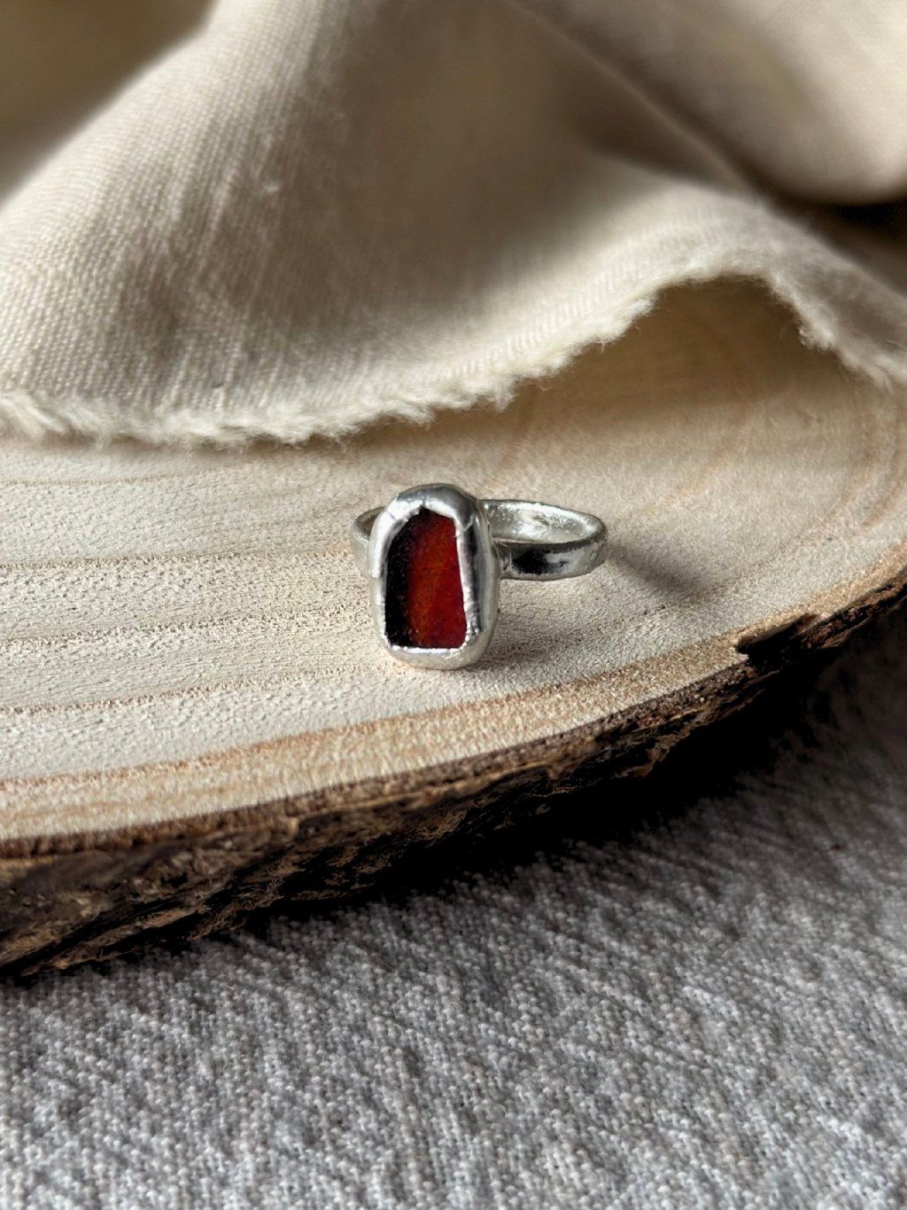Jemný prstýnek z cínu ve stříbrné barvě s červeným upcyklovaným sklem.