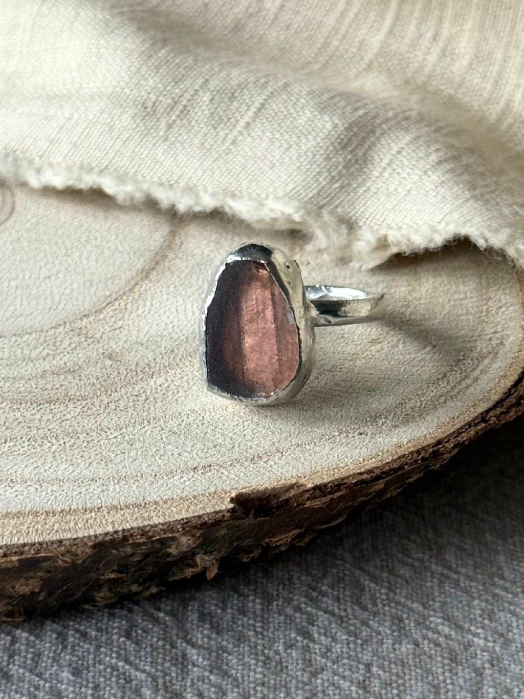 Jemný prstýnek z cínu ve stříbrné barvě s oranžovým upcyklovaným sklem.