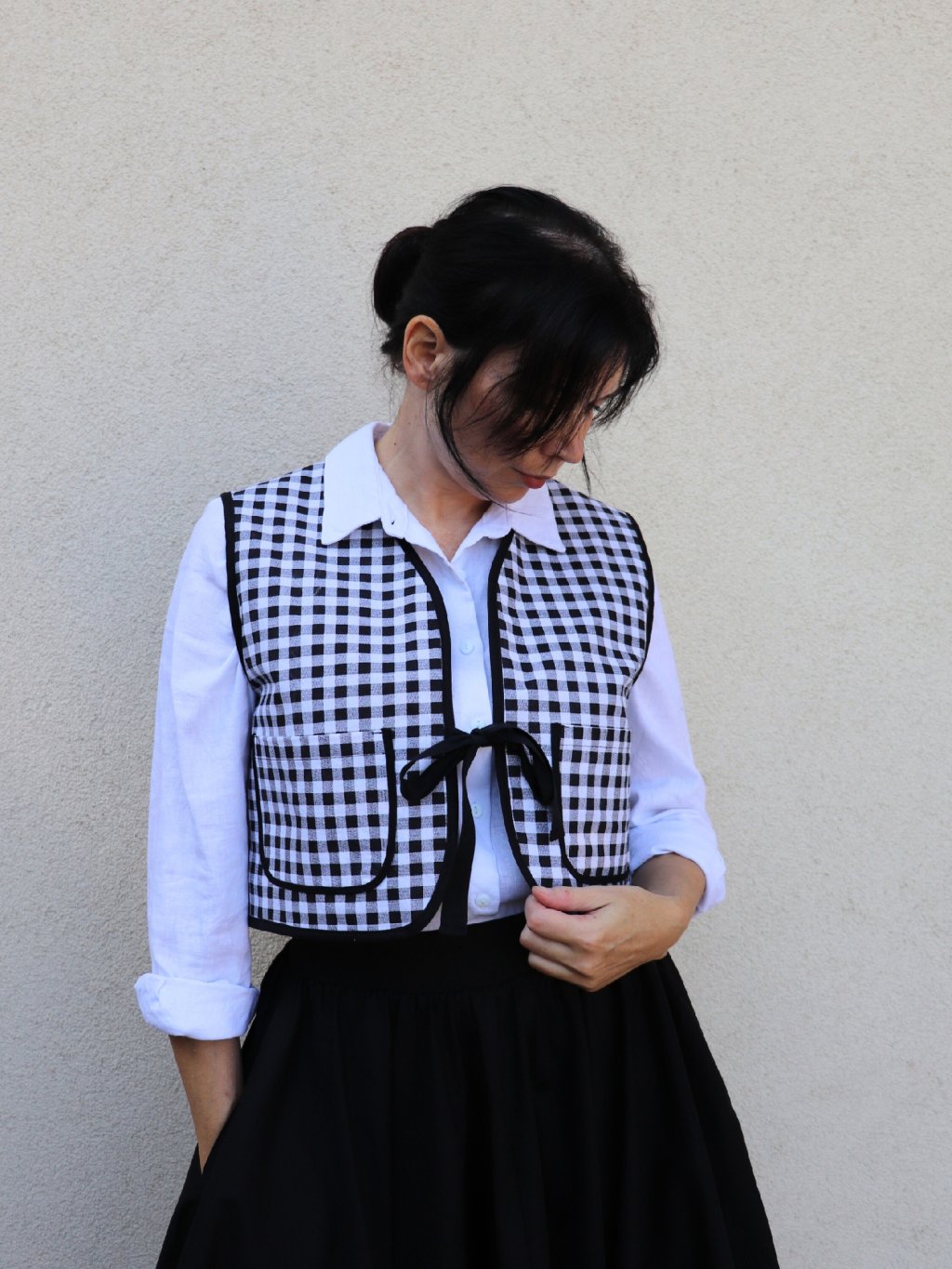 Krátká oboustranná vestička 2v1 - praktická černá na jedné straně a stylové káro na druhé. Kapsičky z obou stran!