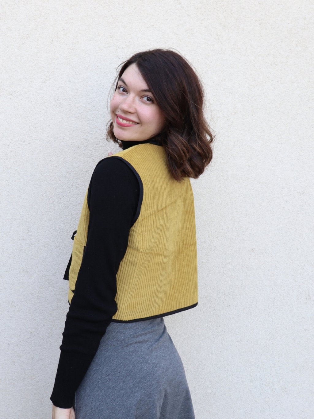 Manšestrová oboustranná vestička 2v1 v hořčicové barvě. Druhá strana basic černá.