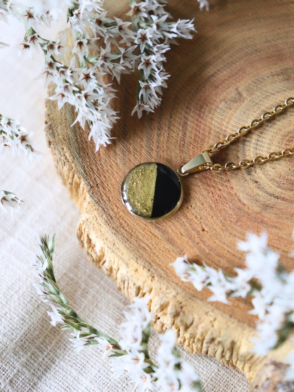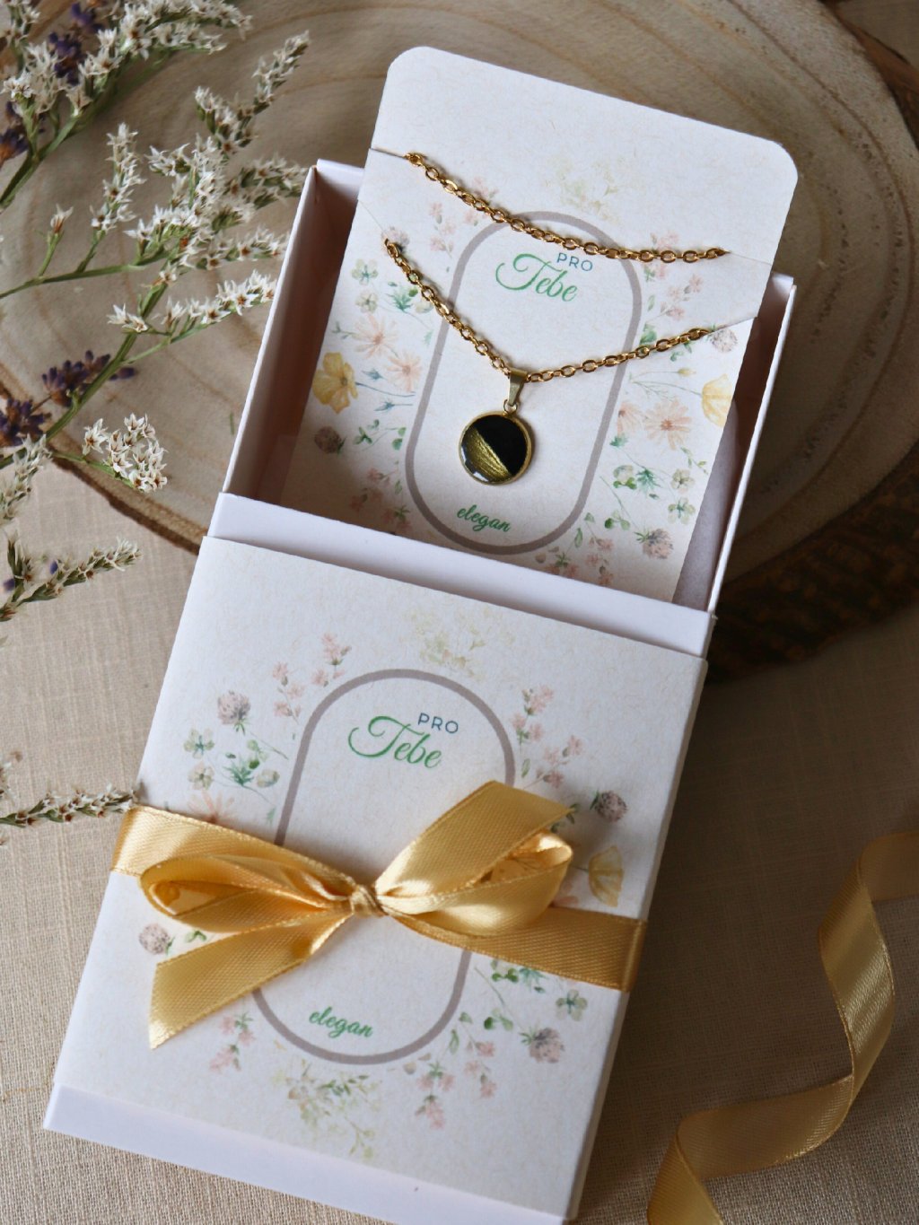 Půlený zlatý a černý medailon na ocelovém řetízku na květované kartičce, zabalený v dárkové krabičce se stejným designem, která je převázaná saténovou stuhou.