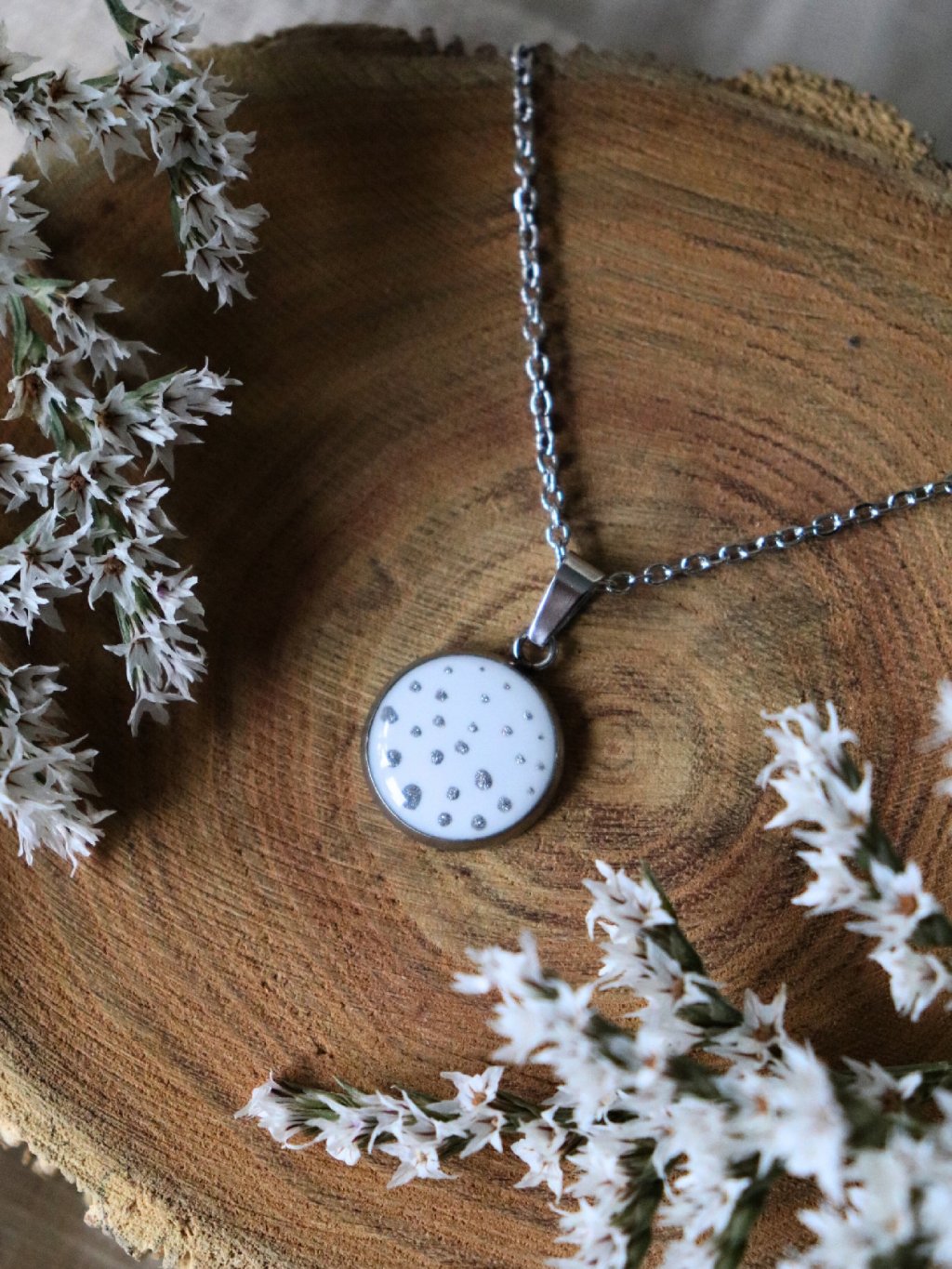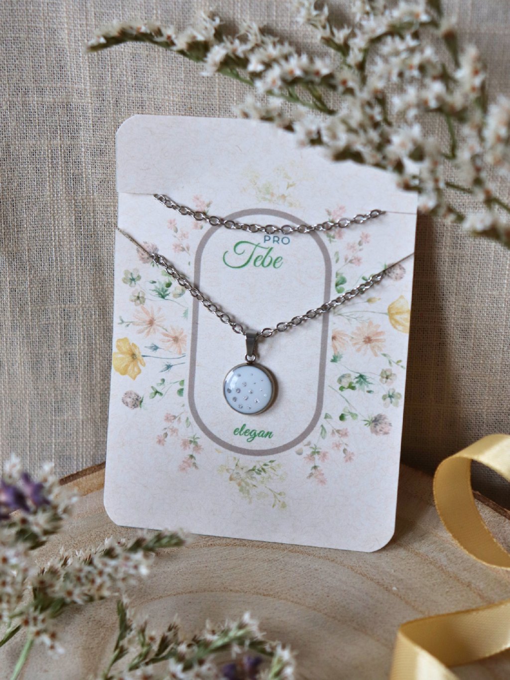 - Ručně vyráběný náhrdelník s elegantním bílým přívěskem zdobeným jemnými tečkami.