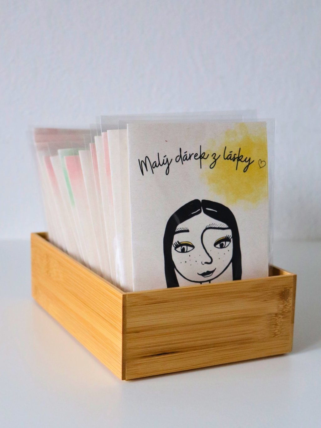 Balení: Přání s peckami k vám docestuje v průhledném celofánovém obalu s lepicí lištou: recyklovatelný polypropylen.