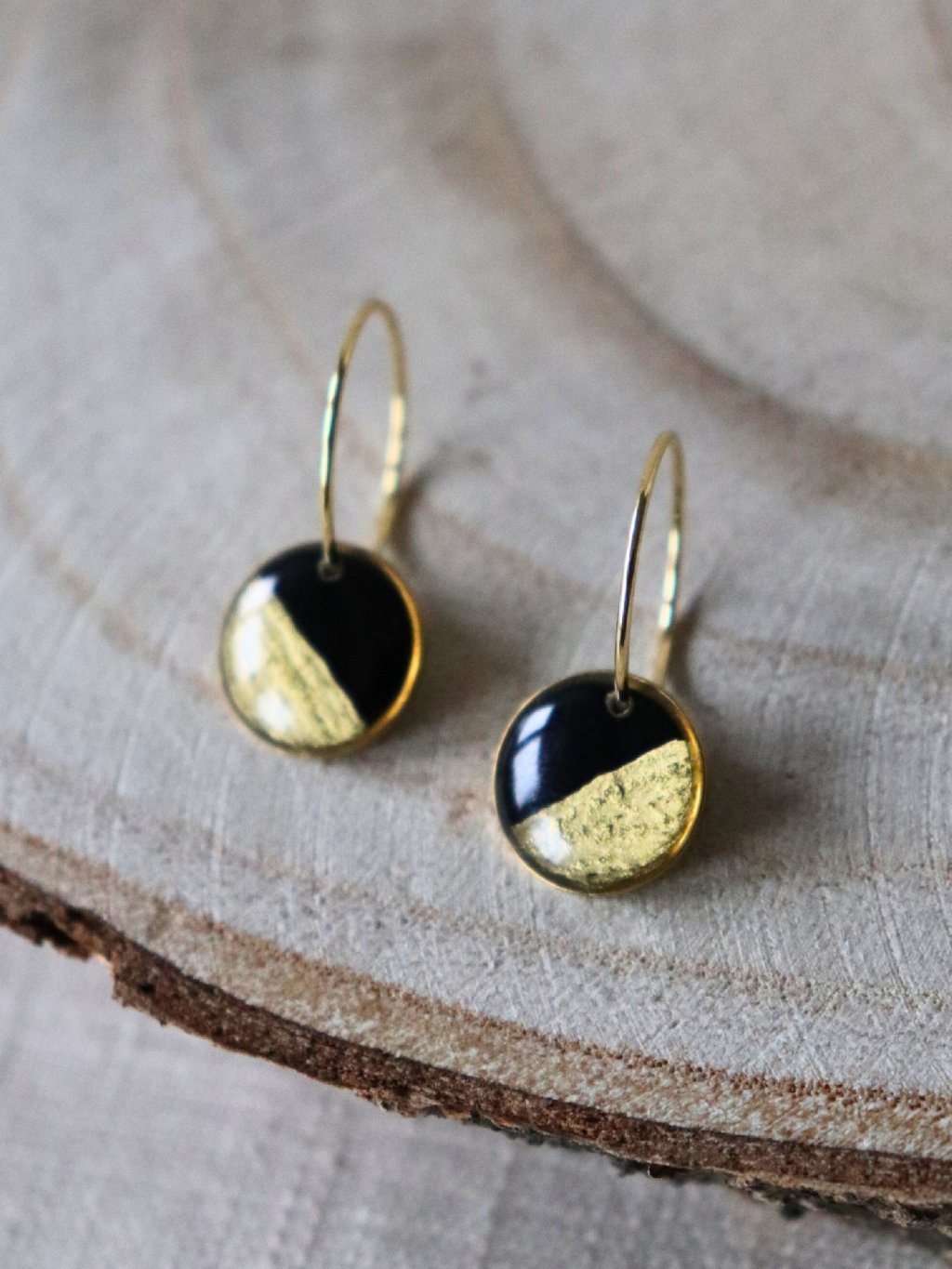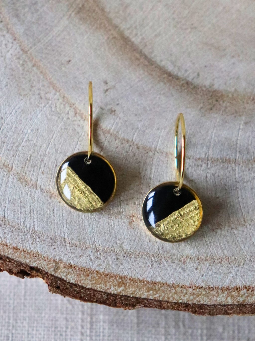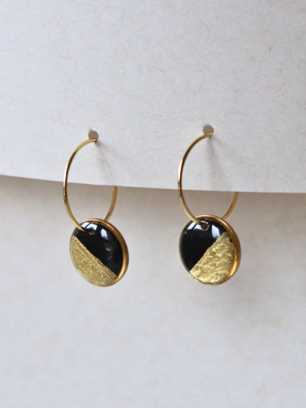 Elegantní černo-zlaté kruhové náušničky s půleným motivem.