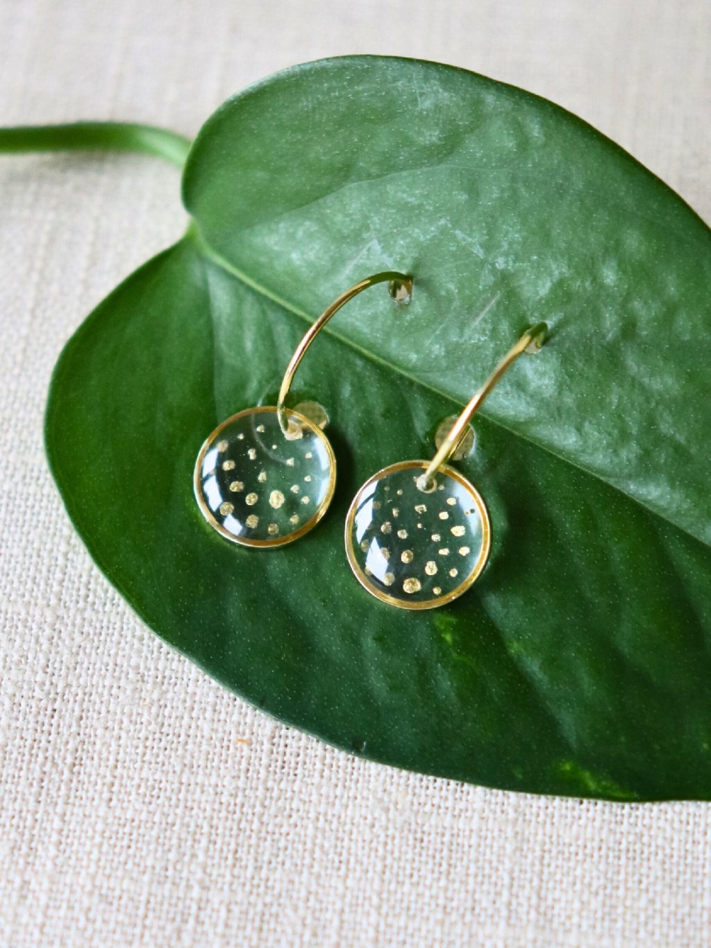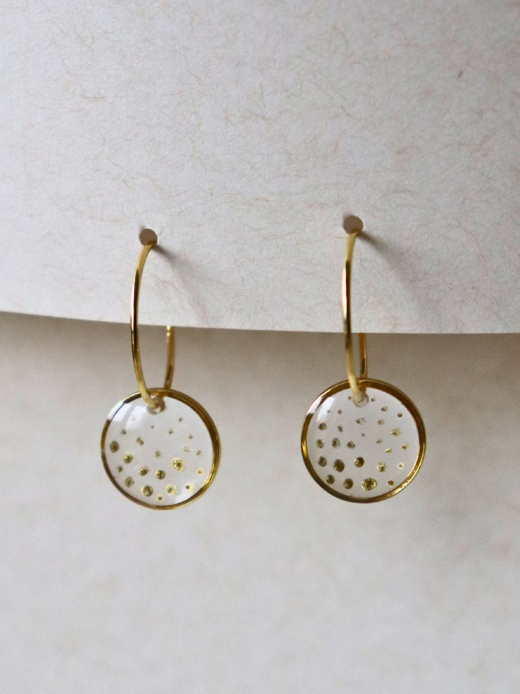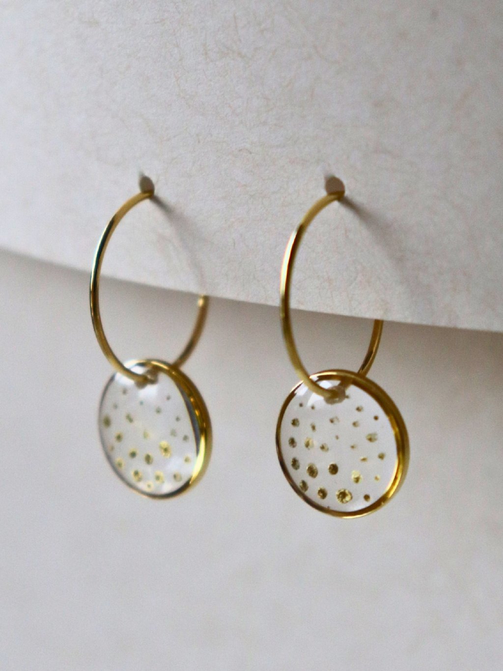 Efektní průhledné náušnice se zlatou. Ručně malované puntíky jakoby se vznášely ve vzduchu.
