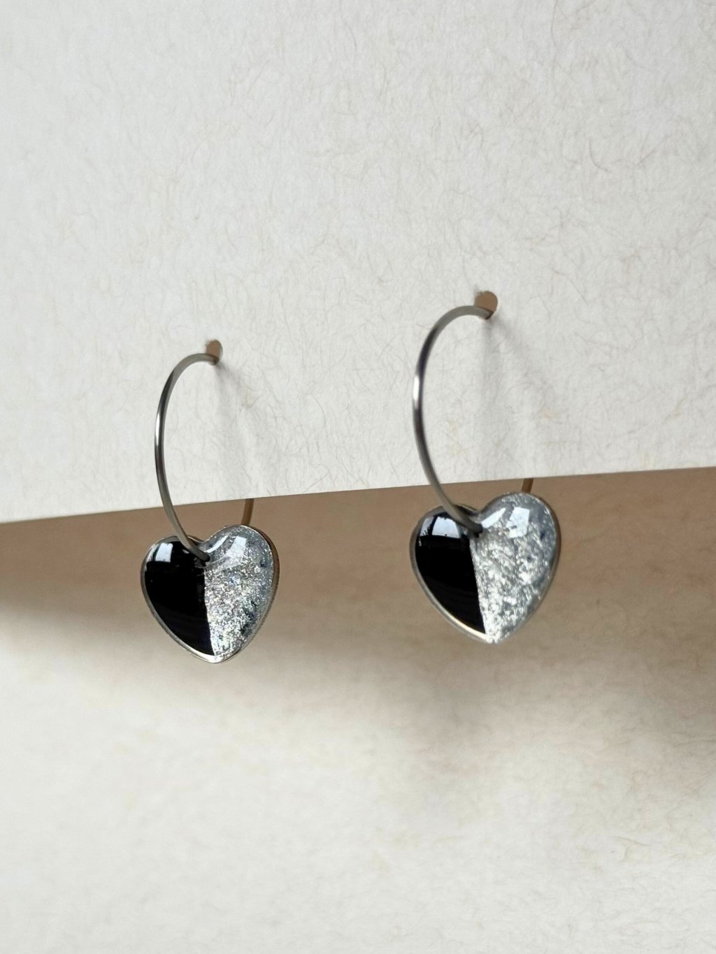 Srdíčkové visací náušnice na ocelovém kroužku ve stříbrné a černé kombinaci.