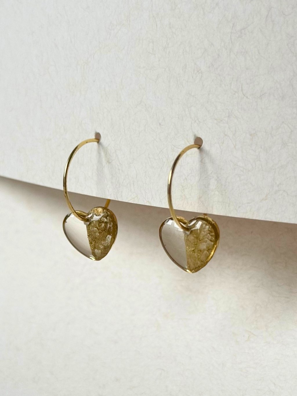 Transparentní zlatá srdíčka na malém kroužku. Visací náušnice z pryskyřice a nerezové oceli. Vyrobeno v Česku v naší rodinné dílně.