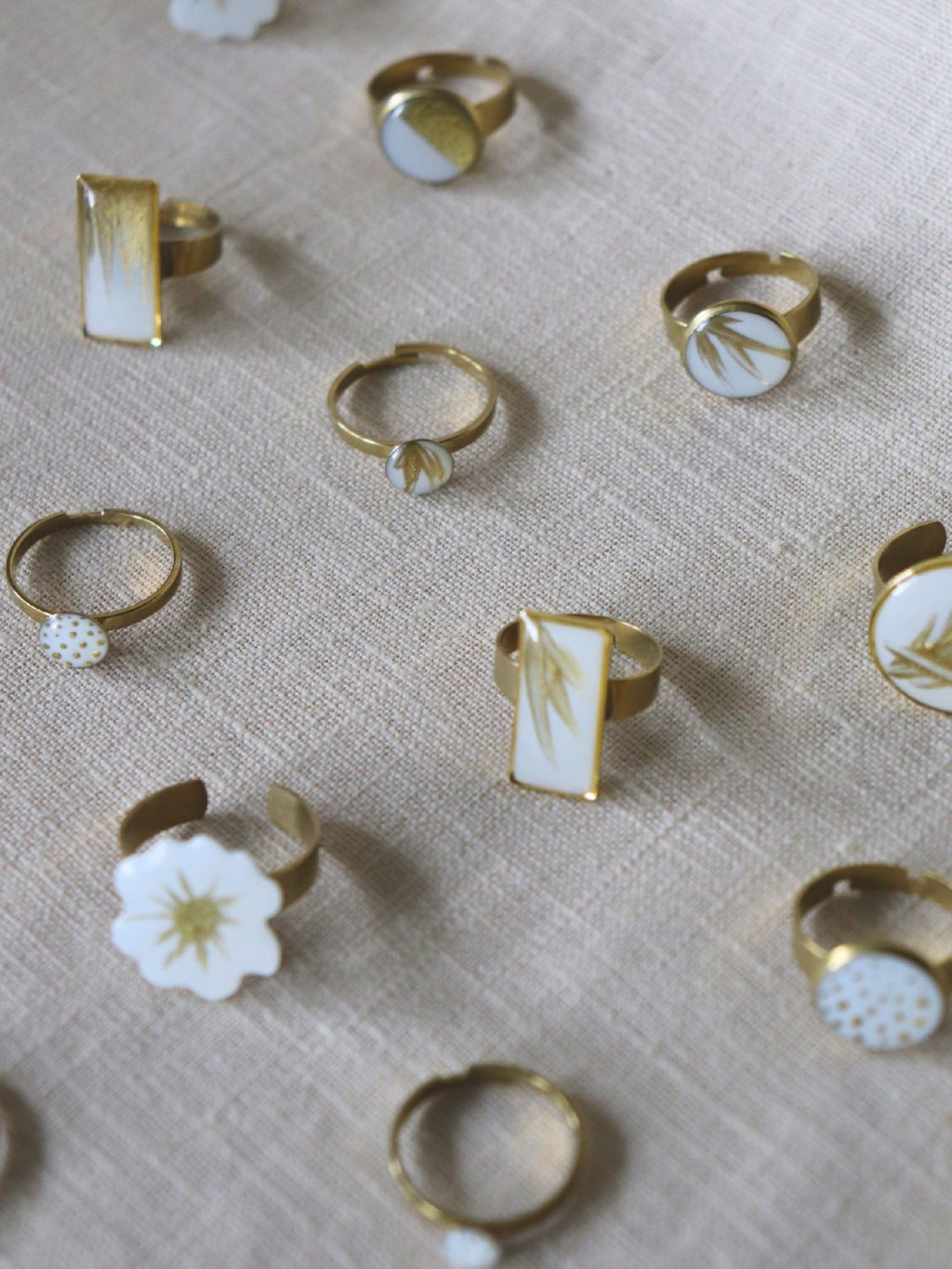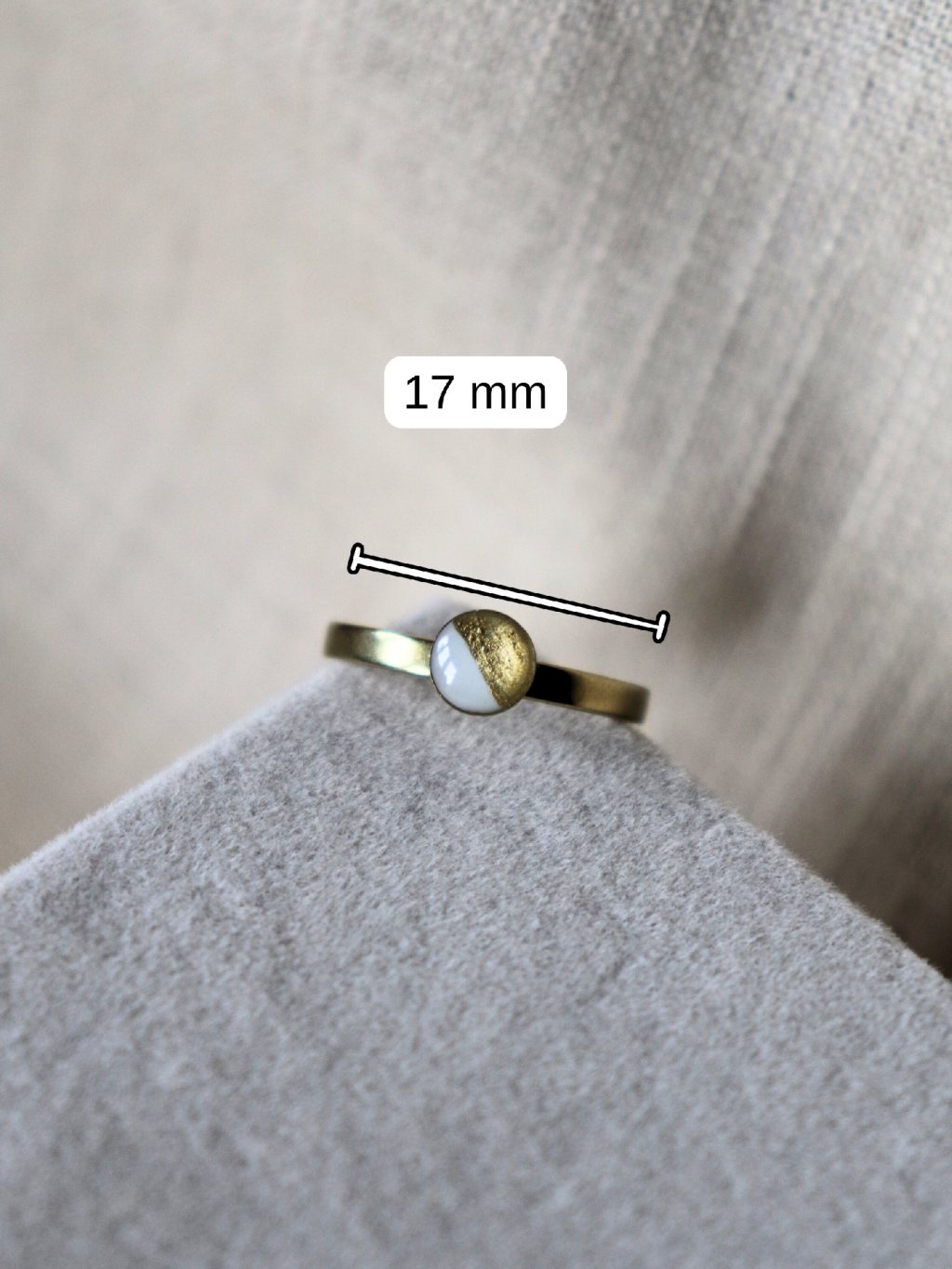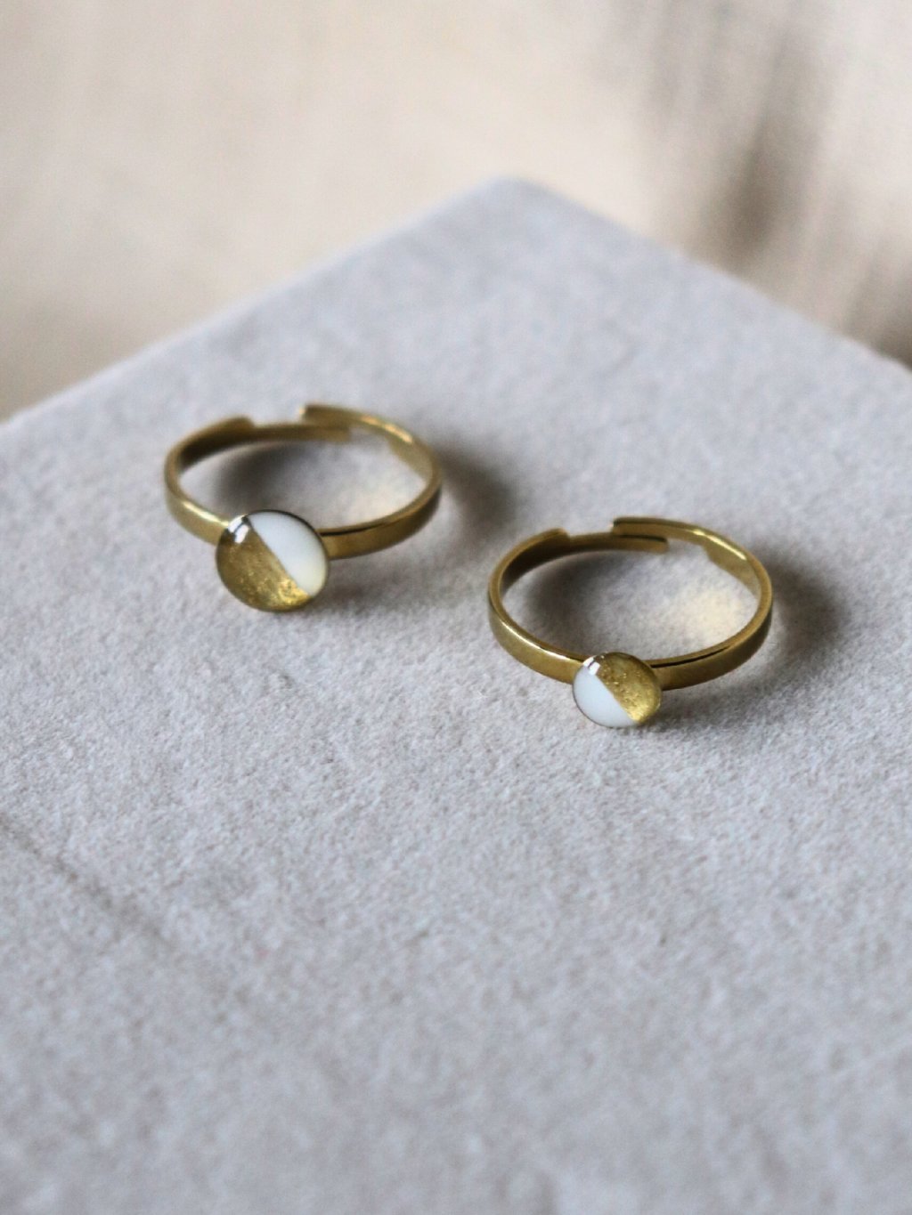 Prstýnek z nerezové oceli se zlatou povrchovou úpravou a bílé pryskyřice jsme ručně odlévali a malovali v našem studiu na Moravě.