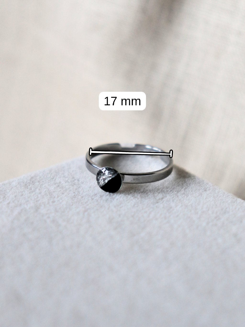 Kroužek kolem prstu má průměr 17 mm, lze opatrně ještě o něco roztáhnout a přizpůsobit.