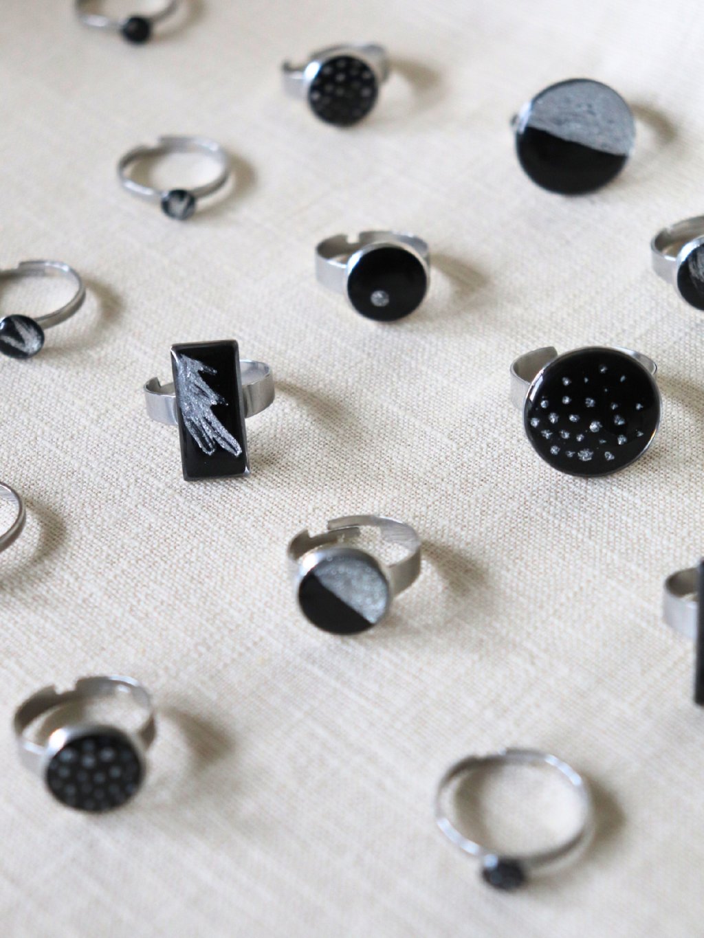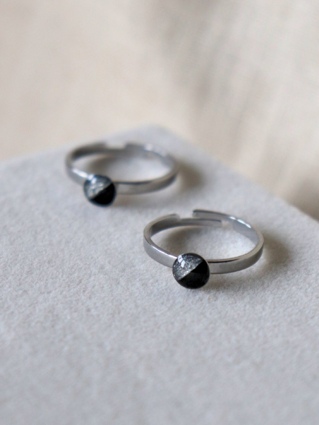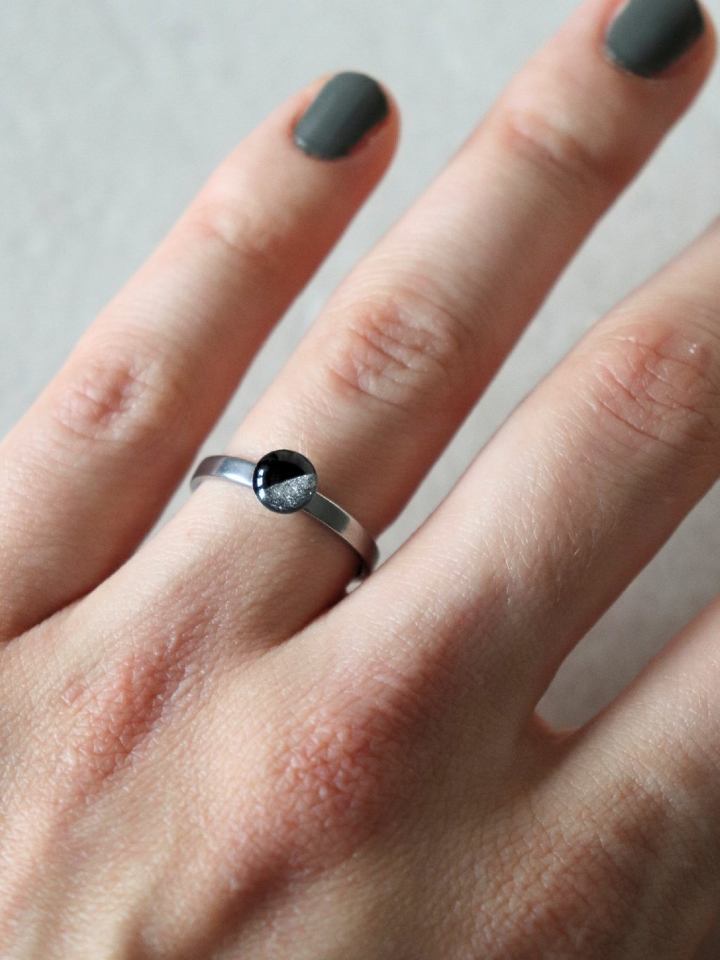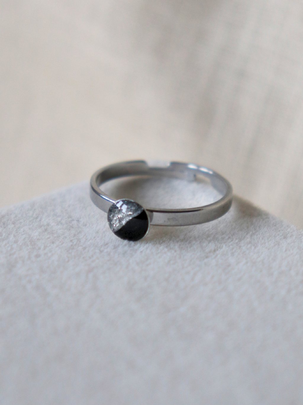 Prstýnek ze stříbrné nerezové oceli a ručně malované černé pryskyřice jsme ručně odlévali a malovali v našem studiu na Moravě. Má krásně lesklý povrch s jemným motivem půlená. Hodí se k dalším šperkům se stejným motivem!