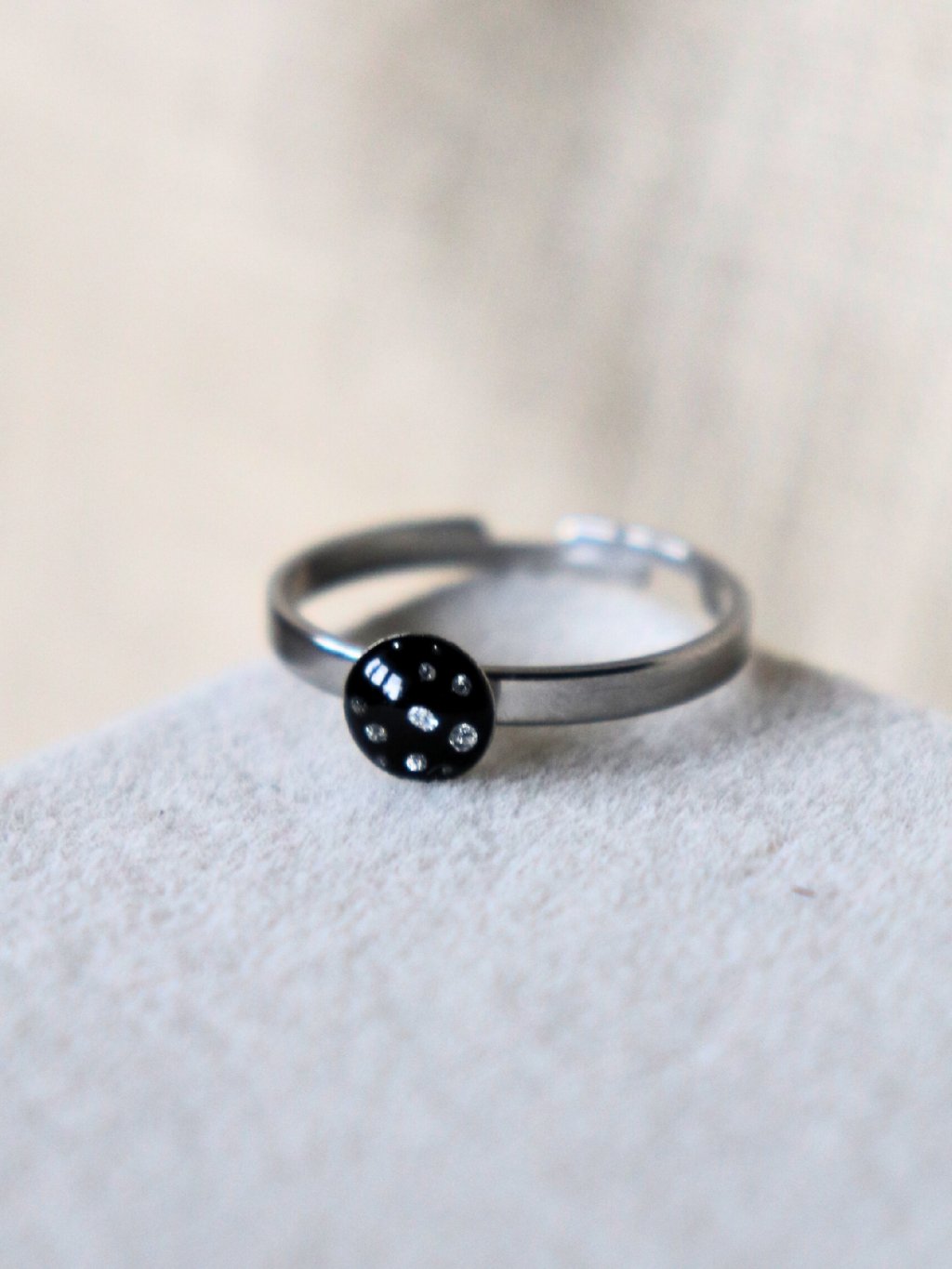Maličký kulatý ocelový prsten v černé barvě s motivem teček.