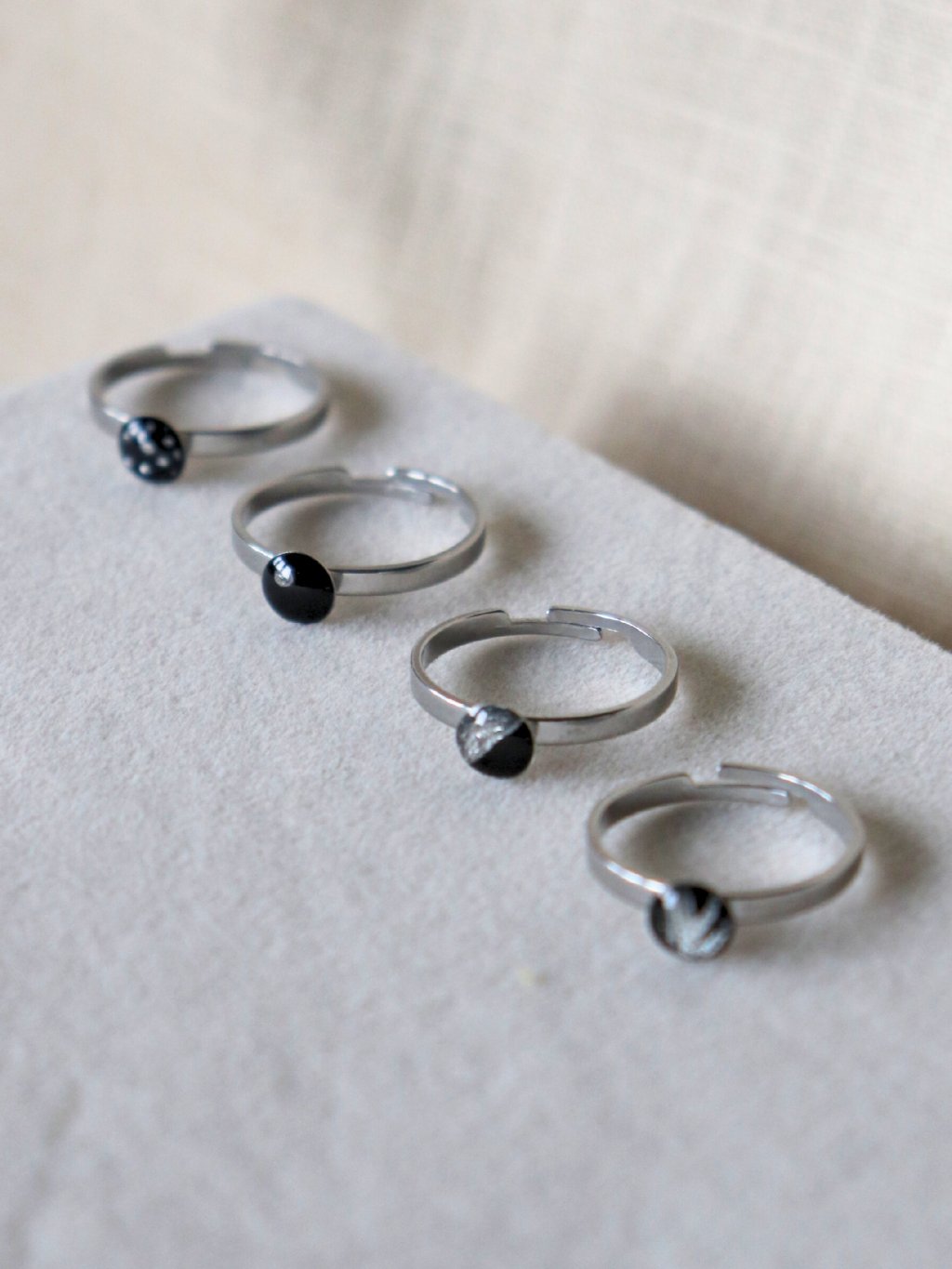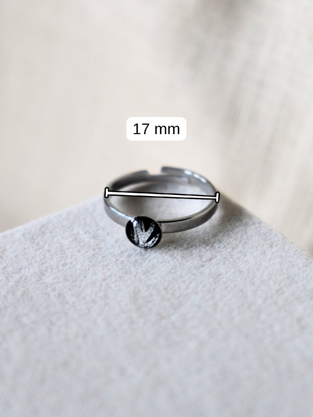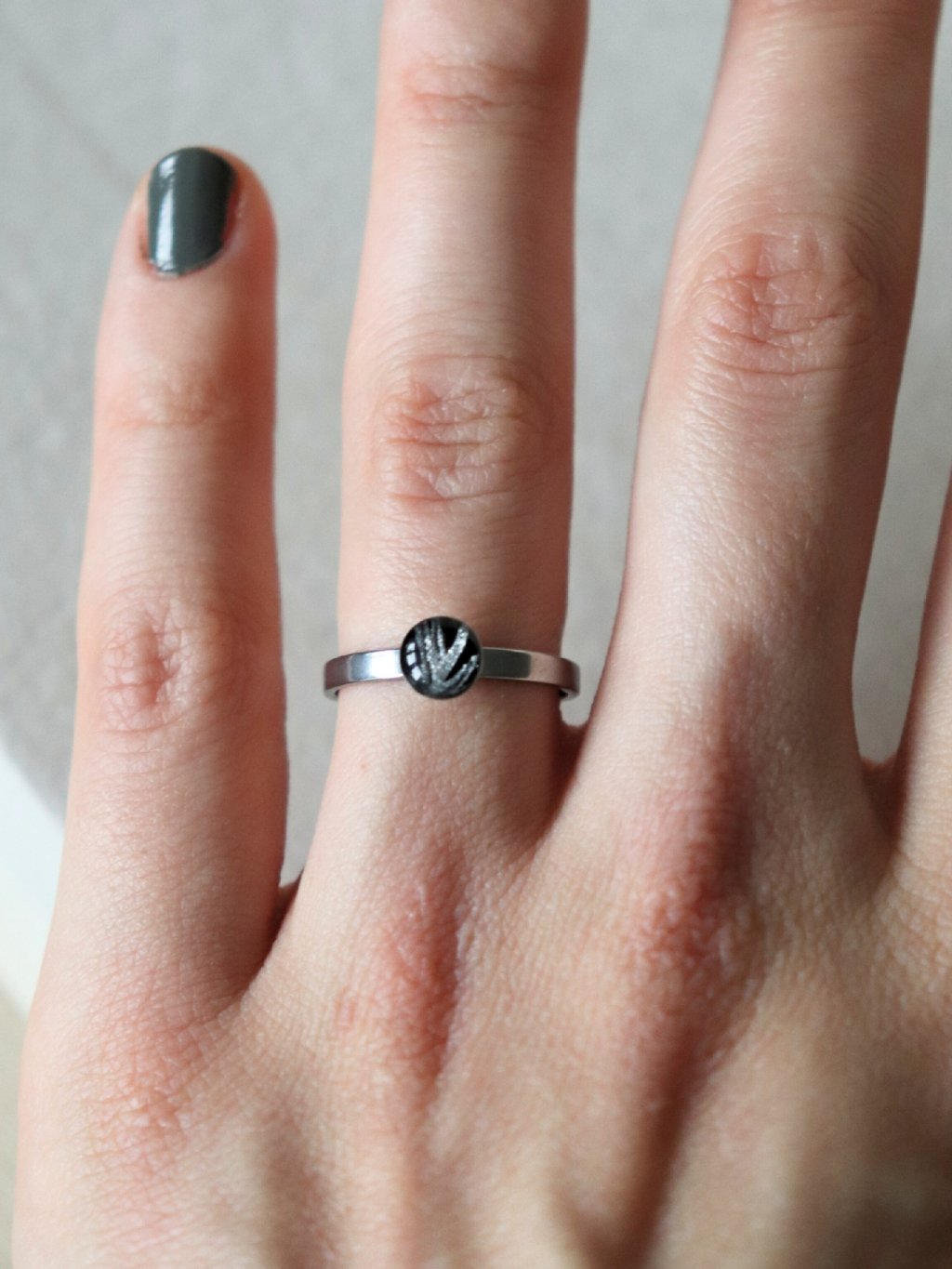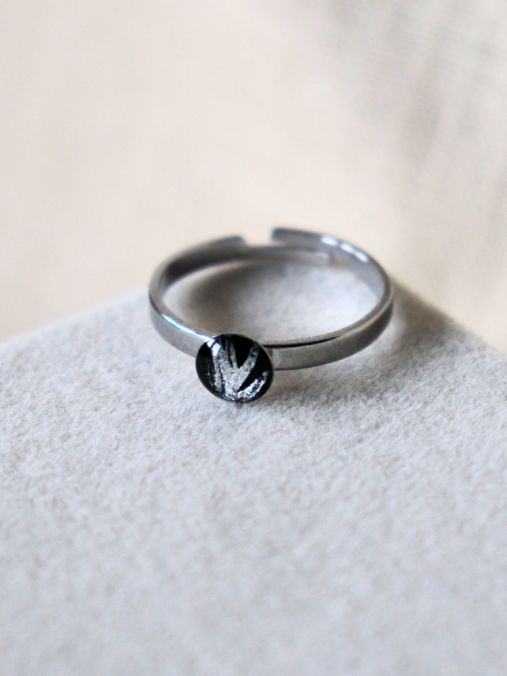 Prstýnek ze stříbrné nerezové oceli a ručně malované černé pryskyřice jsme ručně odlévali a malovali v našem studiu na Moravě. Má krásně lesklý povrch s jemným motivem tahů a čar. Hodí se k dalším šperkům se stejným motivem!
