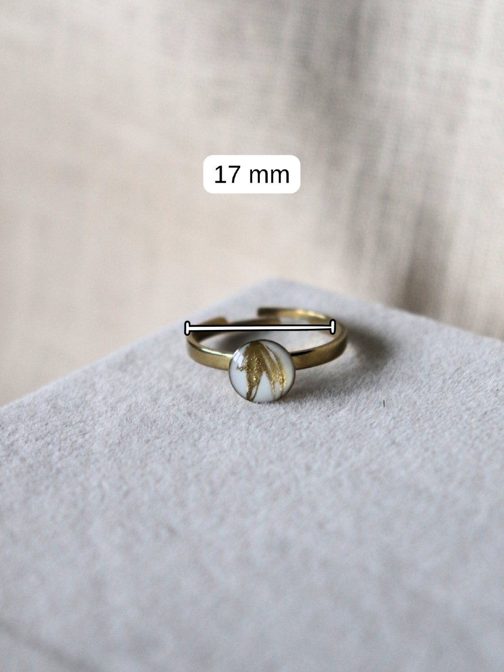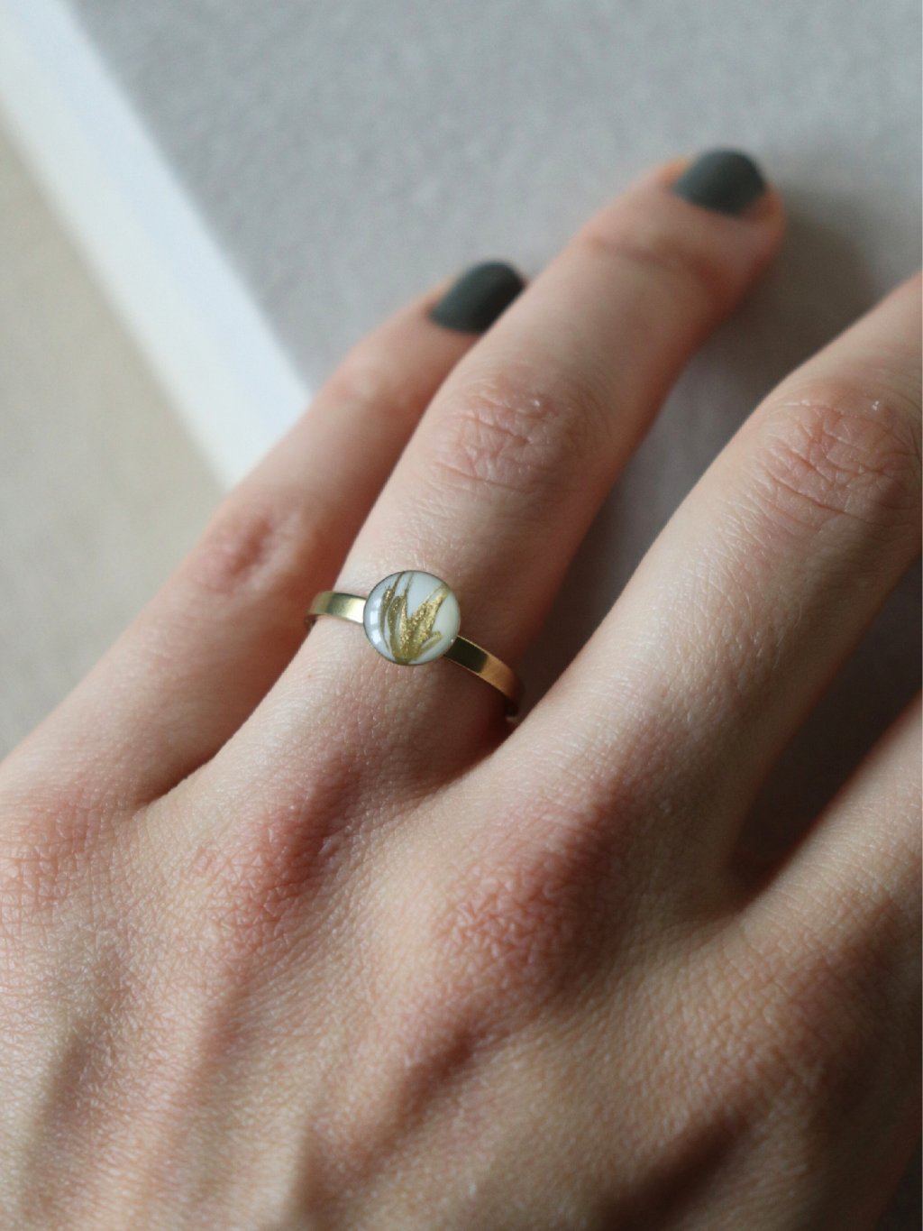 Prstýnek z nerezové oceli se zlatou povrchovou úpravou a bílé pryskyřice jsme ručně odlévali a malovali v našem studiu na Moravě.