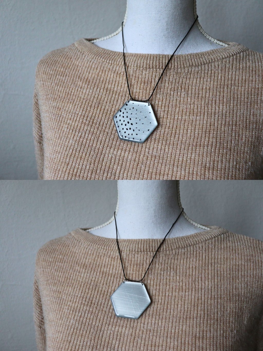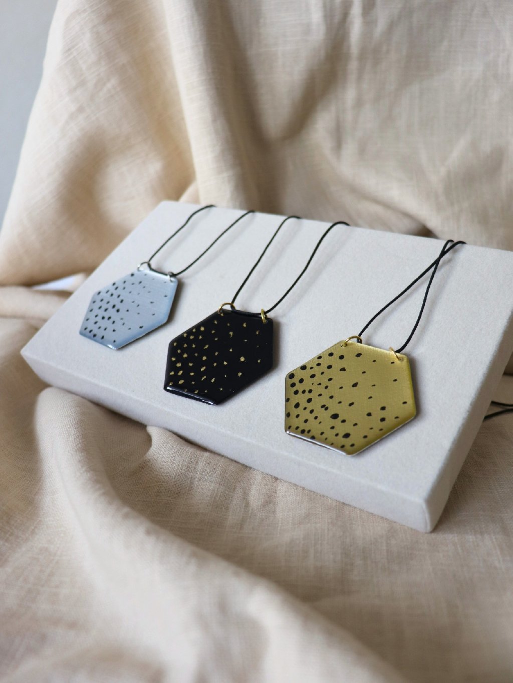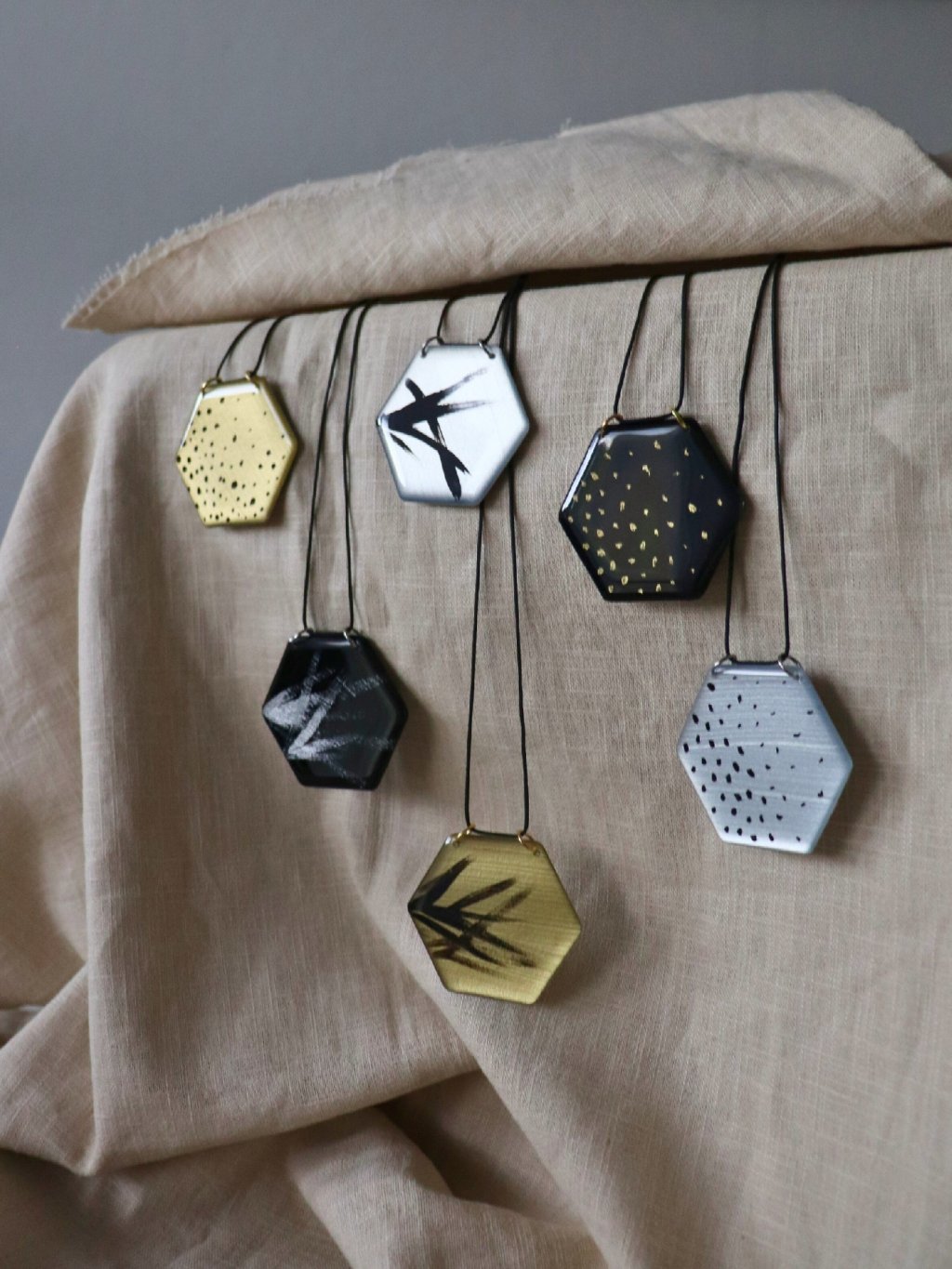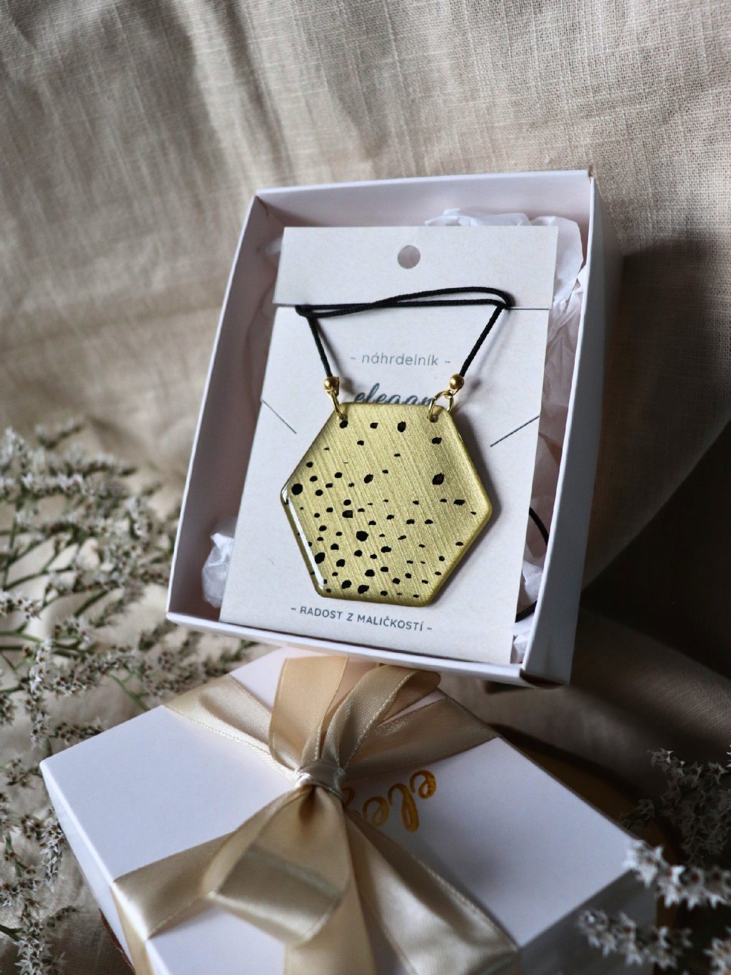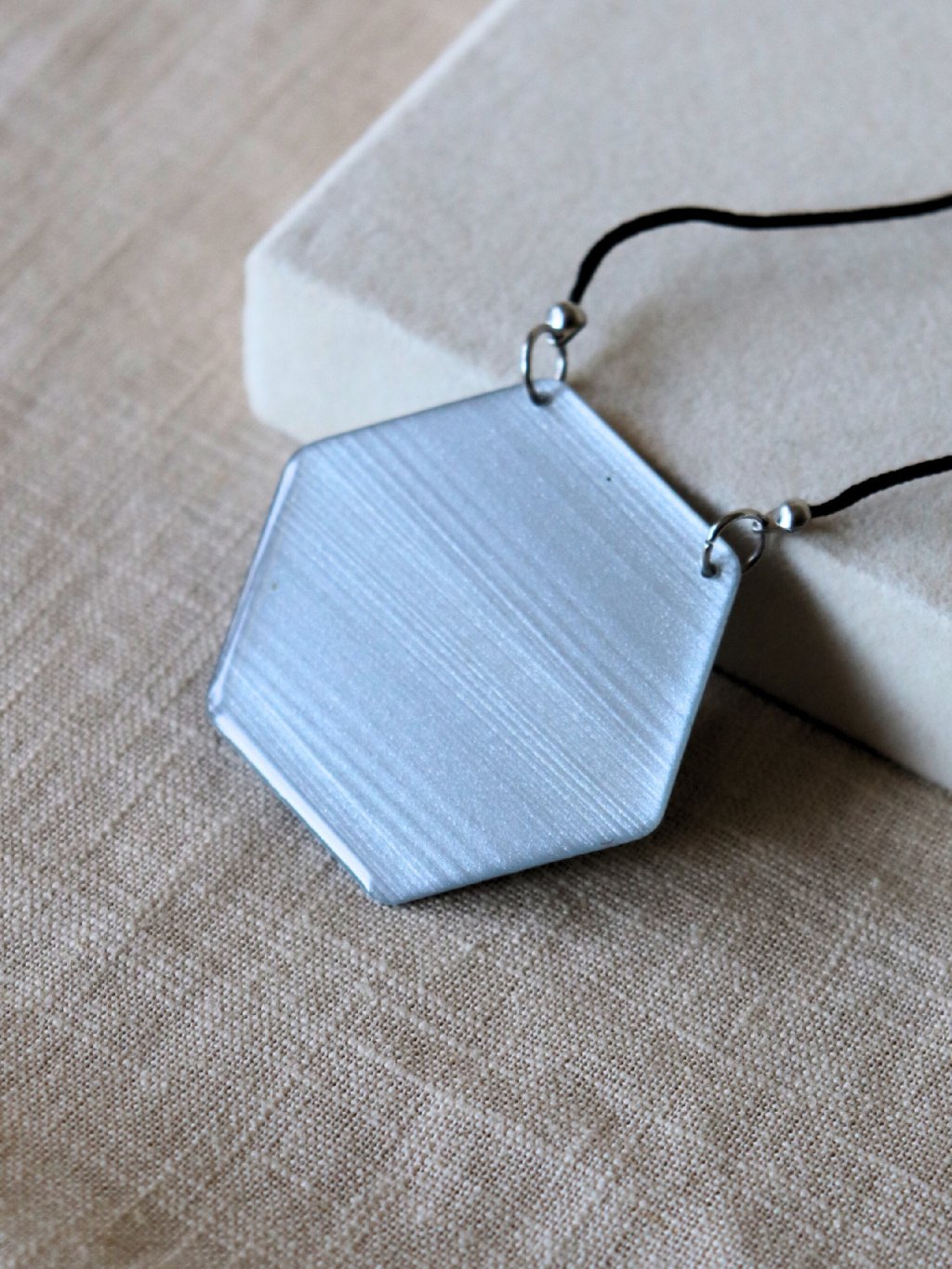 Tento náhrdelník z pryskyřice má tvar hexagonu. Jednoduchá minimalistická barevnost se hodí téměř ke každému outfitu, čímž se tento náhrdelník stává praktickým a stylovým doplňkem pro každou příležitost. Zlaté a stříbrné odstíny přidávají nádech luxusu, hodí se tak i na slavnostní události.