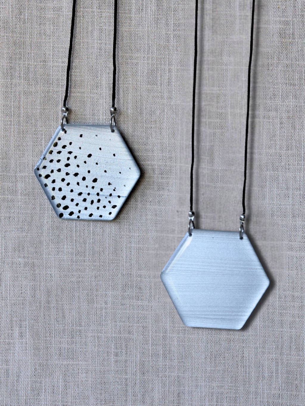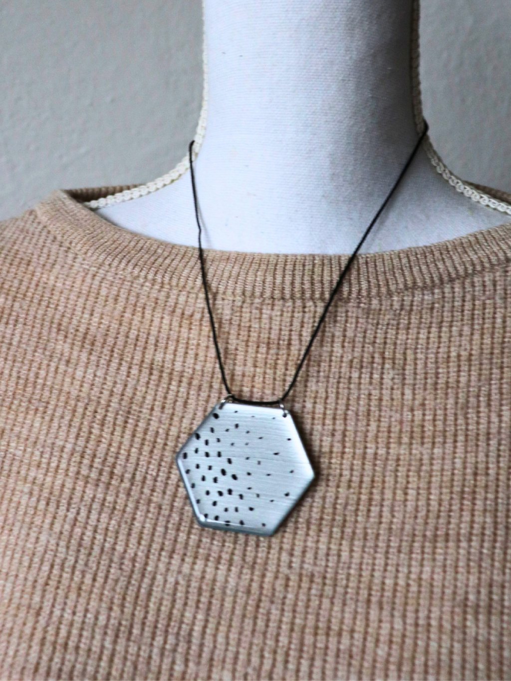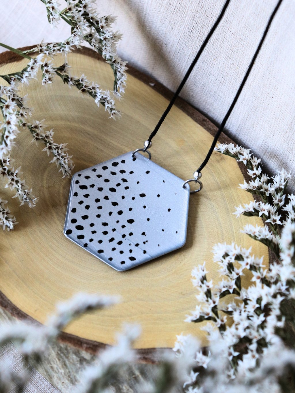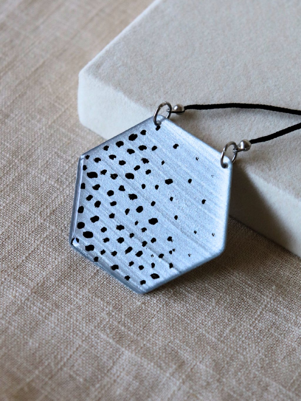 Výrazný náhrdelník ve tvaru hexagonu - plástve. Efektní stříbrná barva s černými tečkami.