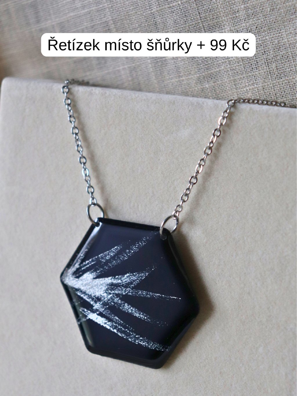 Materiál: pryskyřice, nerezová ocel, polyesterový provázek