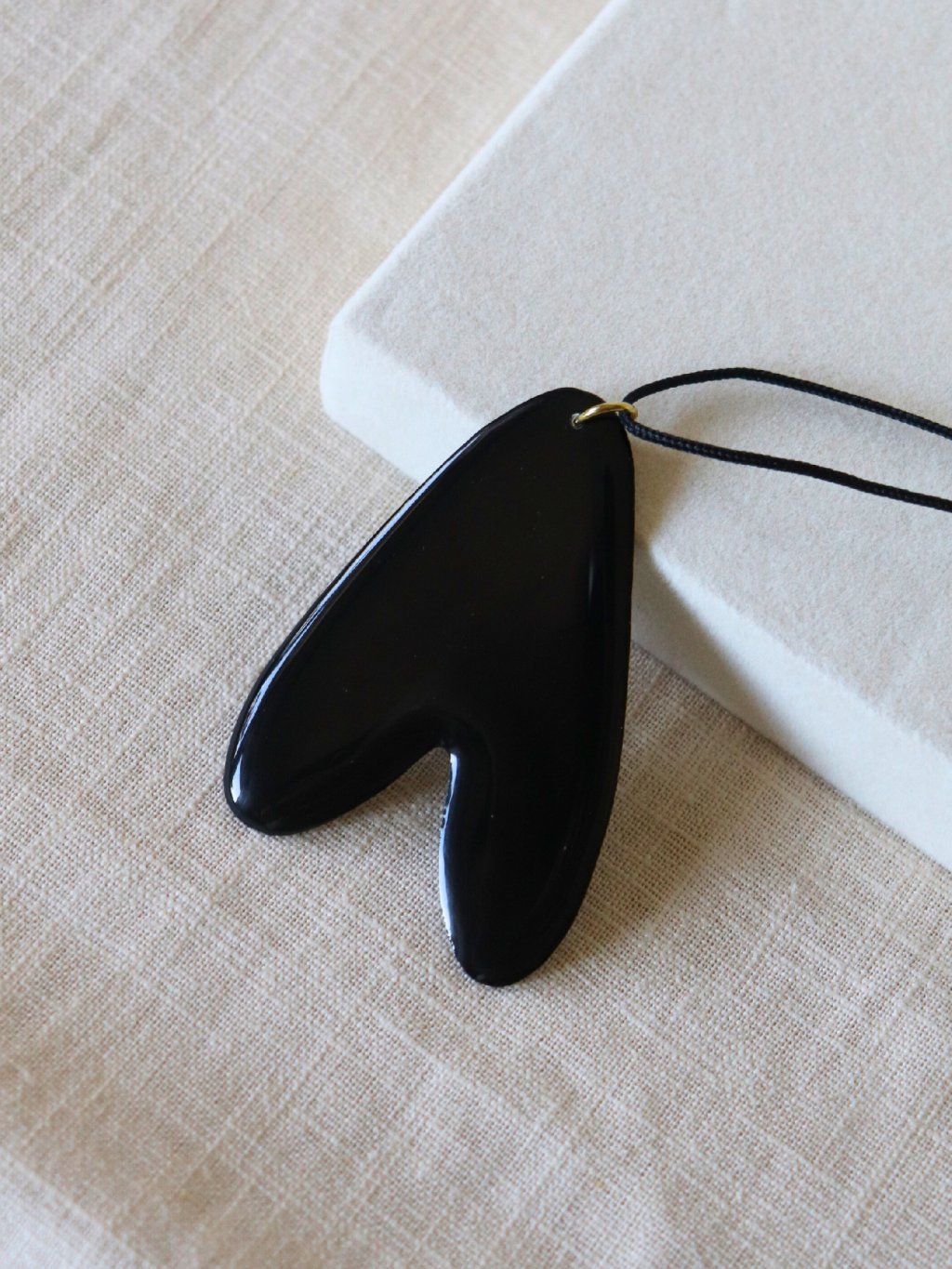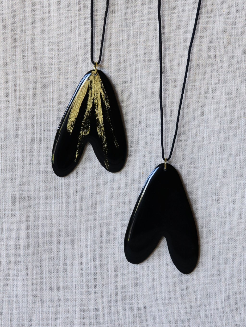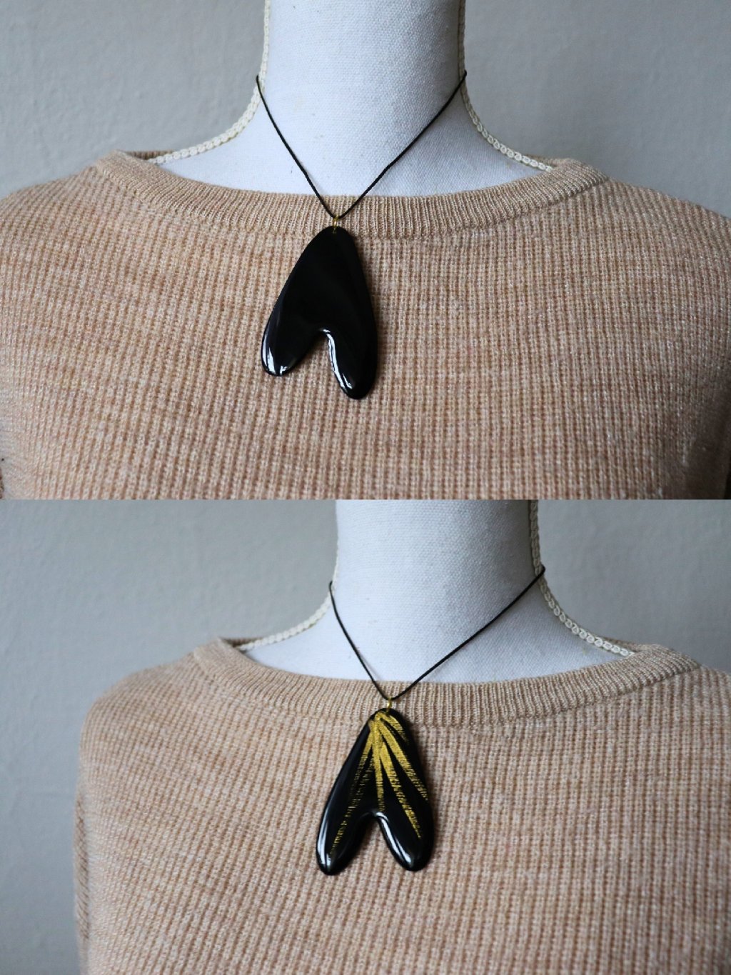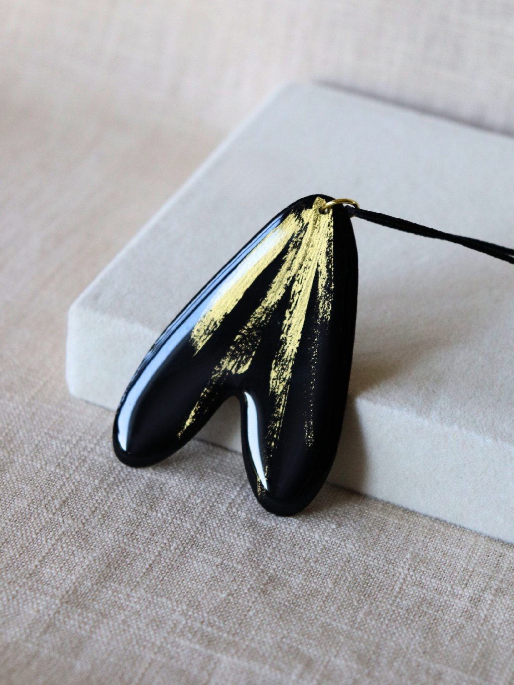 Véčkový lesklý přívěsek v černo-zlaté kombinaci.