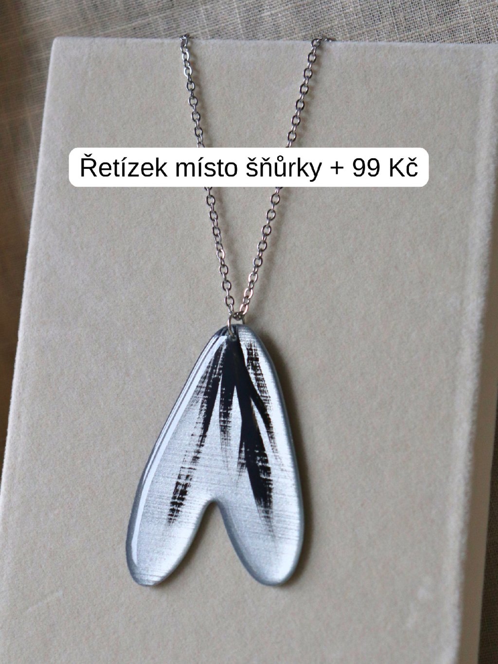 Materiál: pryskyřice, nerezová ocel, polyesterový provázek