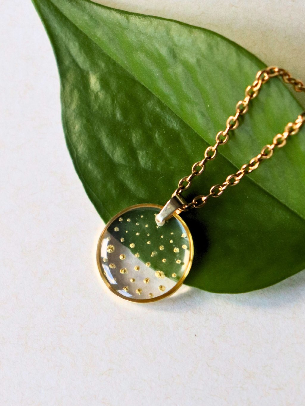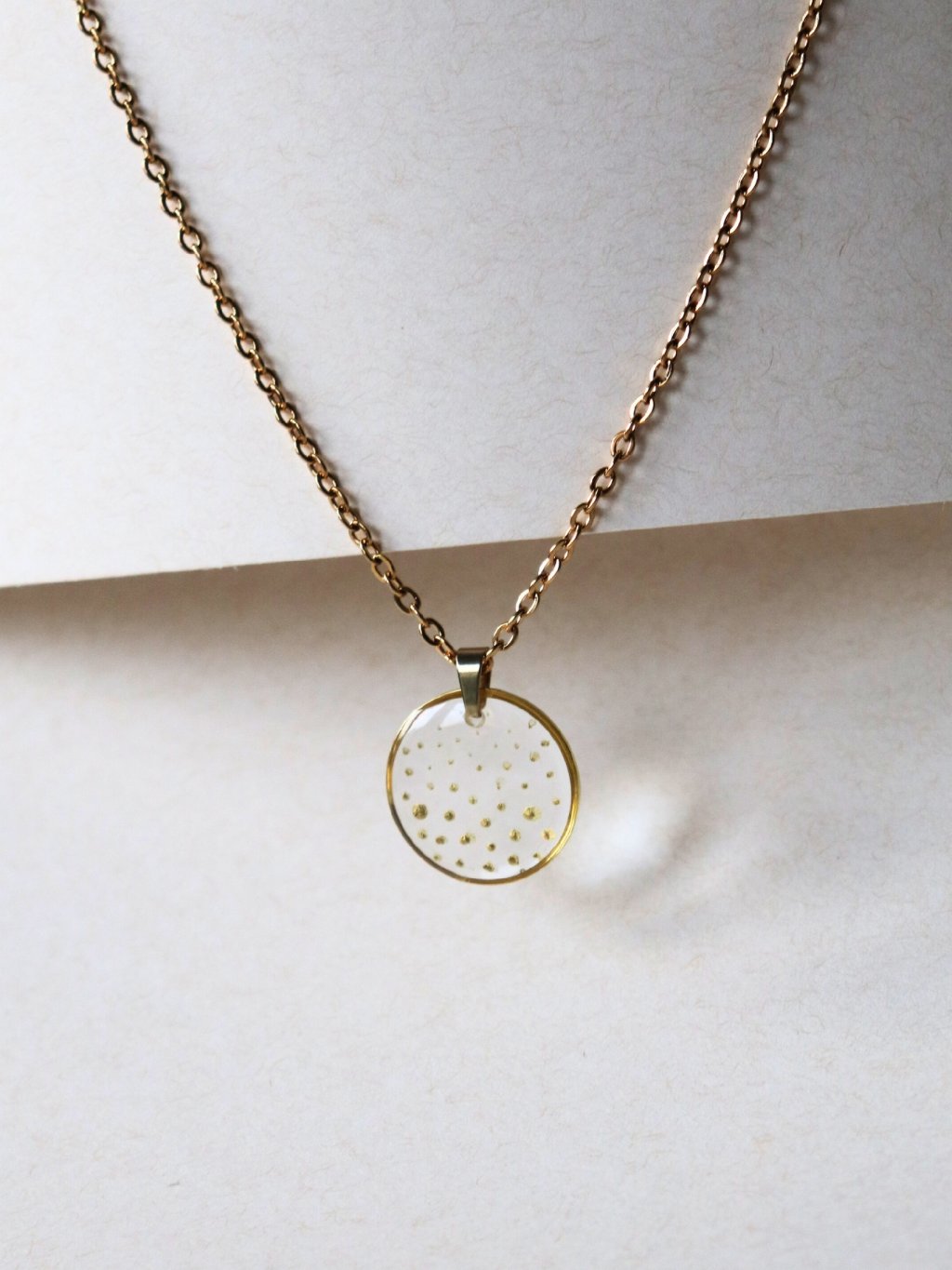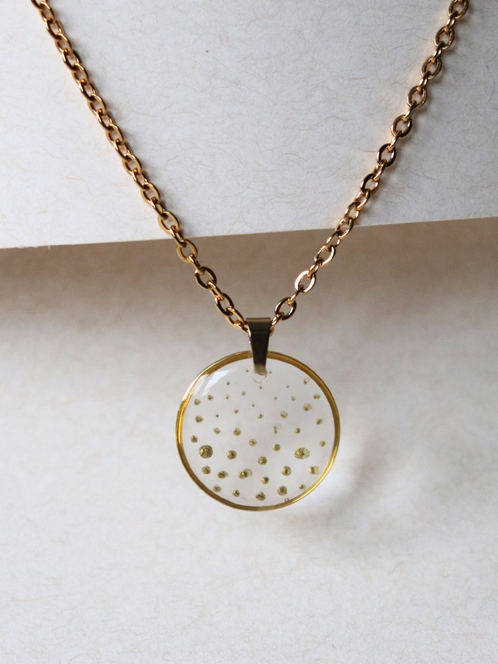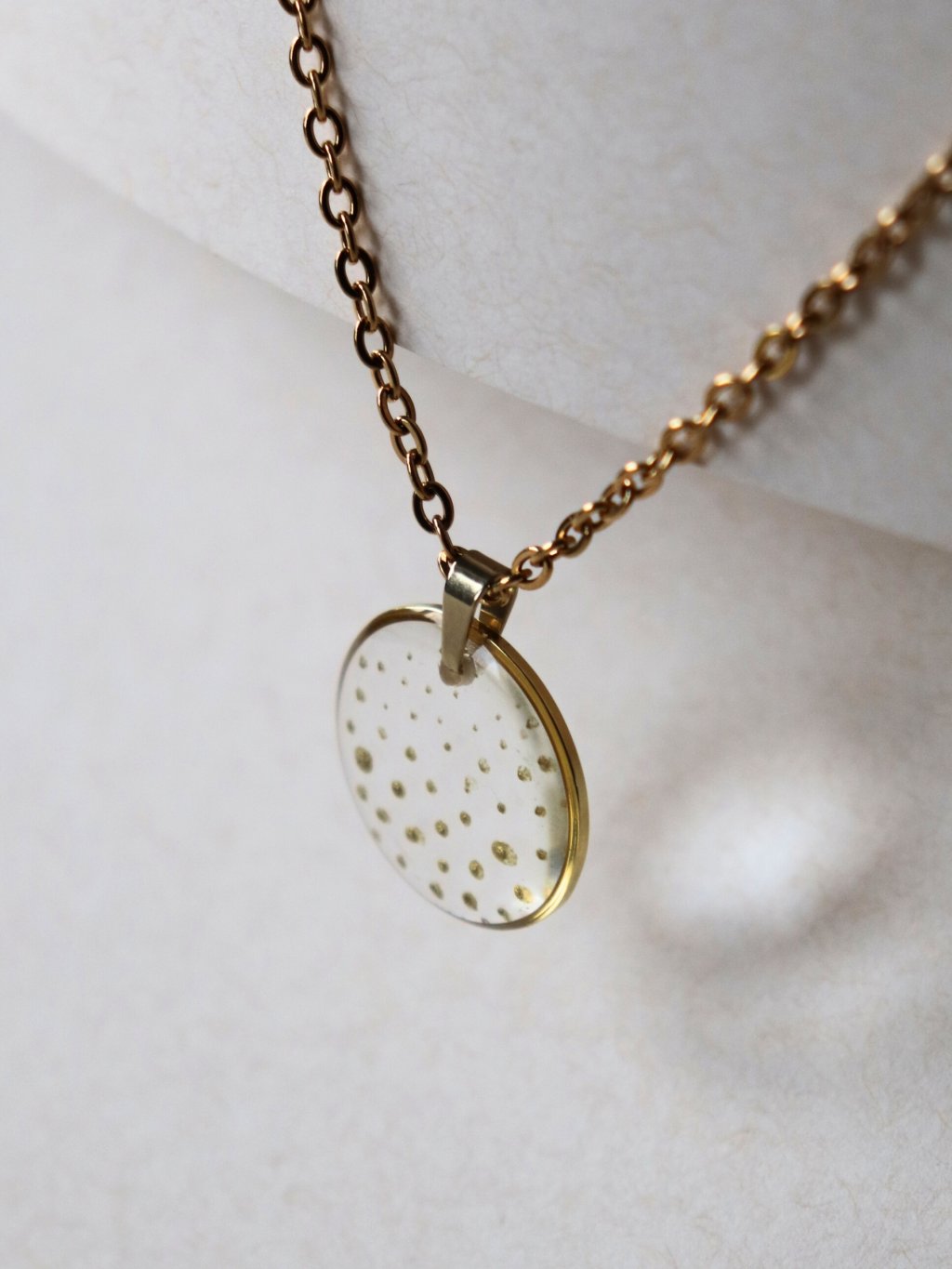 Efektní průhledný náhrdelník zlatý na ocelovém řetízku a s ruční malbou puntíků.