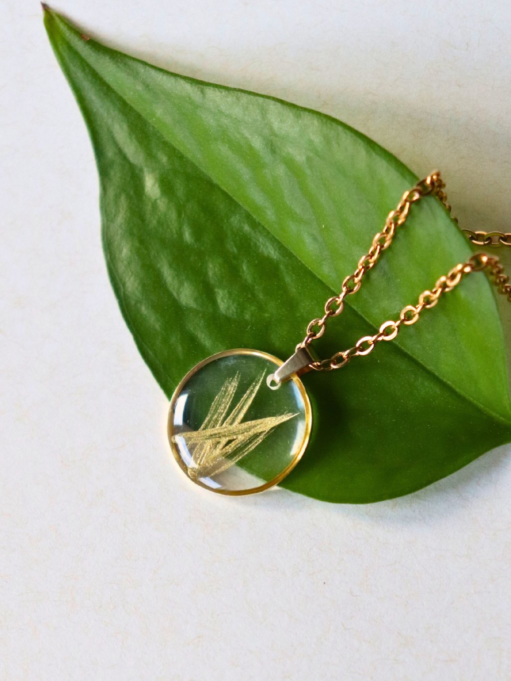 Transparentní zlatý přívěsek na ocelovém řetízku s abstraktním motivem tahů.