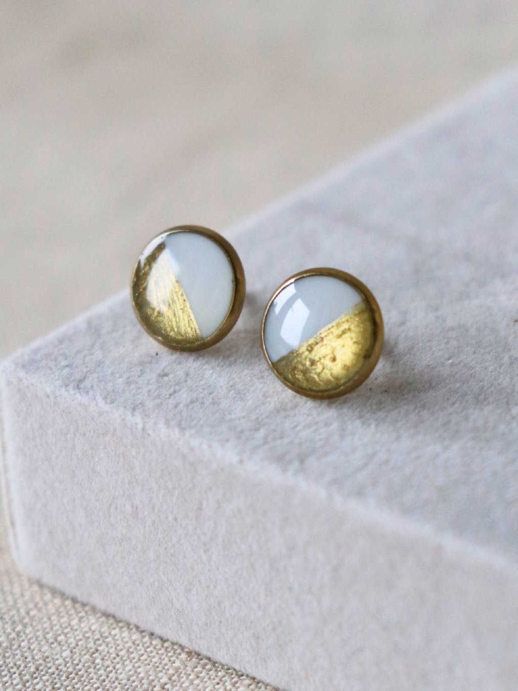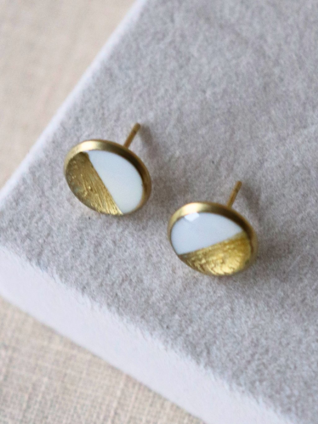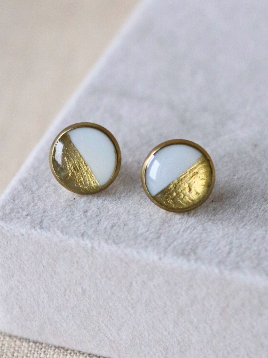 Elegantní půlené zlato-bílé náušky. Nerezová ocel a pryskyřice.