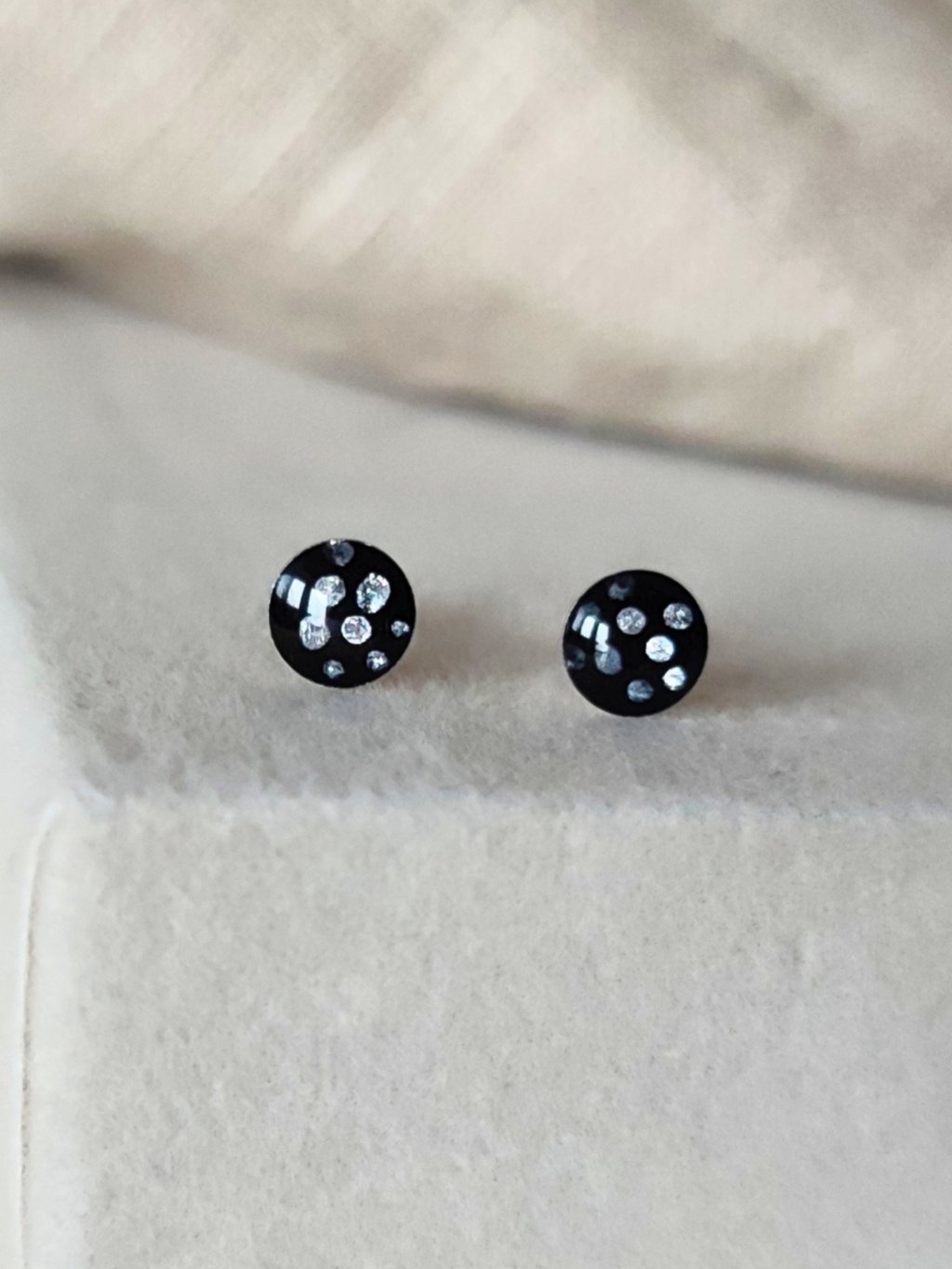 Drobné 6 mm velké náušnice v kombinaci černé a stříbrné barvy.