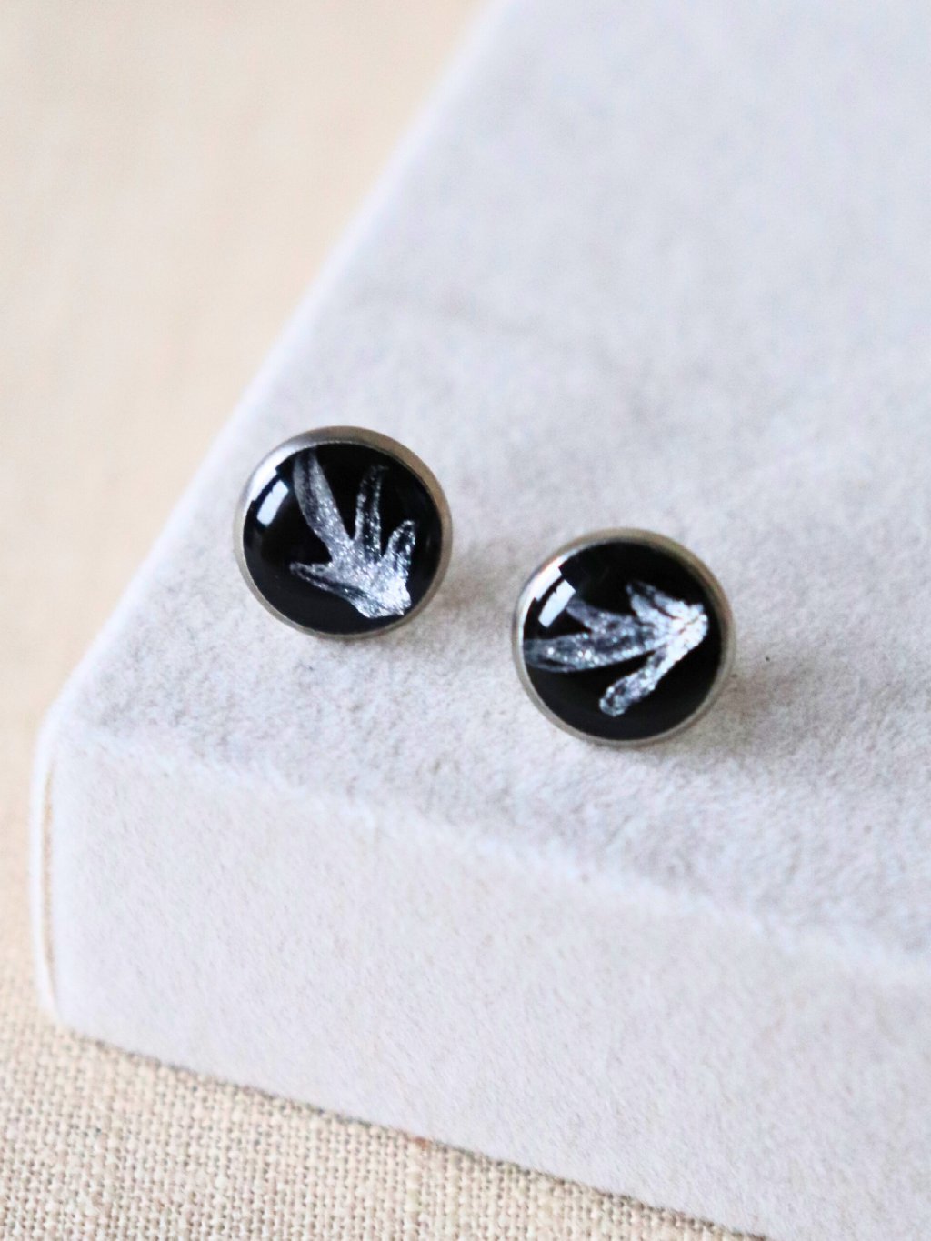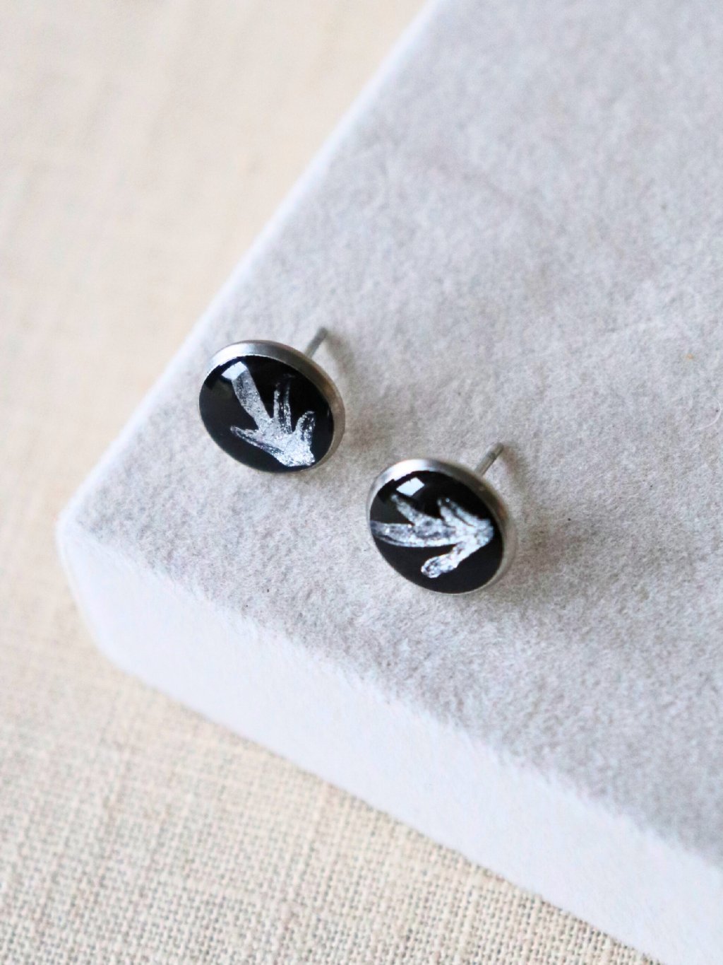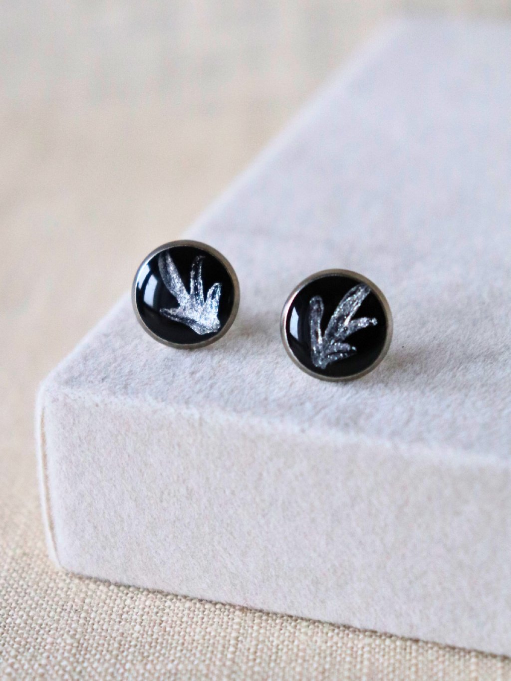 Ručně malované pecičky s tahy štětce, vyrobené z pryskyřice a nerezové oceli. Náušnice jsme vyrobili v našem rodinném ateliéru na Moravě.