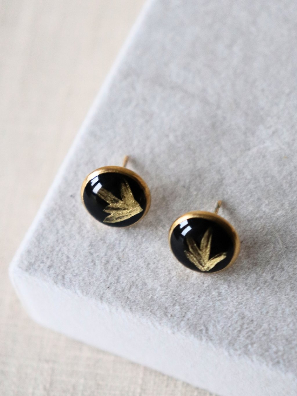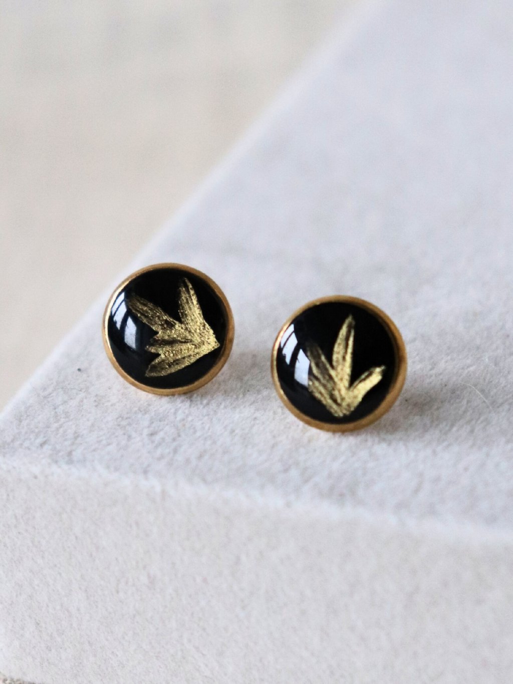 Ručně malované pecičky s tahy štětce, vyrobené z pryskyřice a nerezové oceli. Náušnice jsme vyrobili v našem rodinném ateliéru na Moravě.