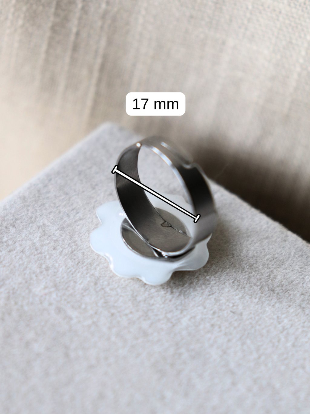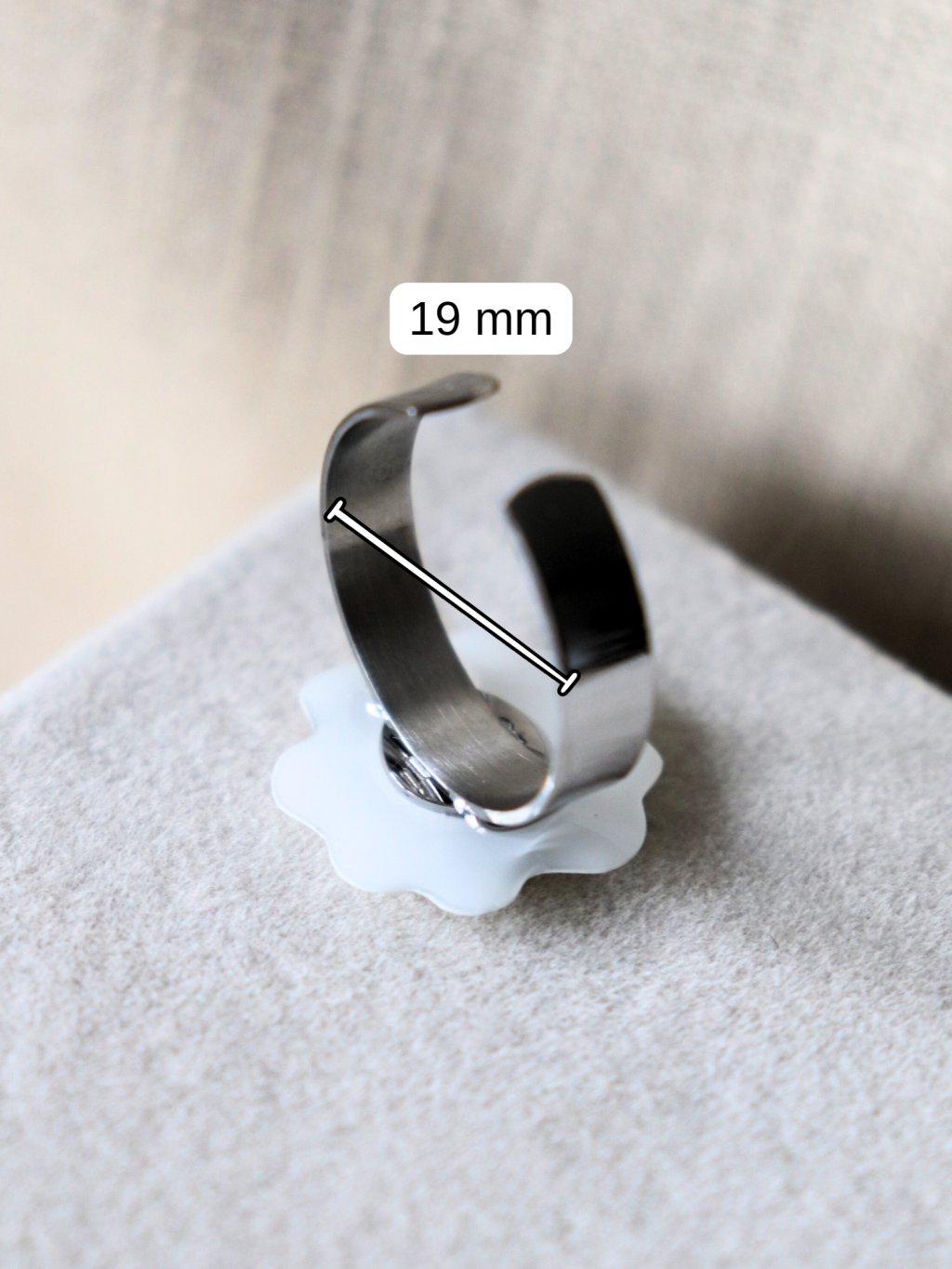 Kroužek kolem prstu ve dvou velikostech má průměr 17 a 19 mm, lze ještě o něco roztáhnout a přizpůsobit.