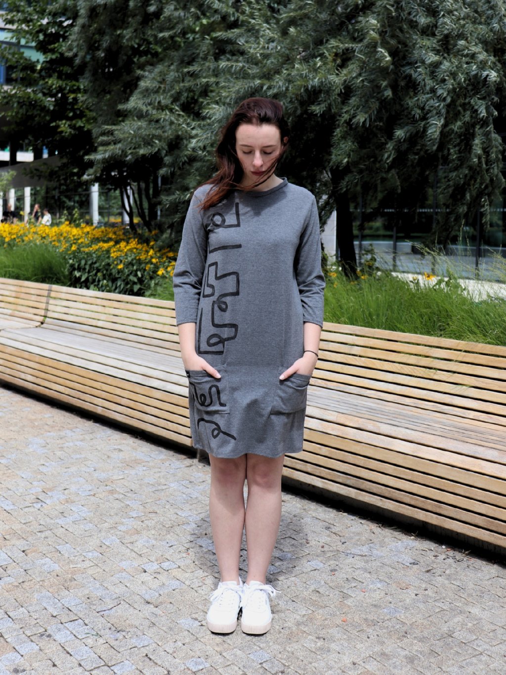 Univerzální šedé šaty s kapsami a moderním potiskem. Tříčtvrteční rukáv a kulatý výstřih - velikost M (sedí od S až do menšího L).