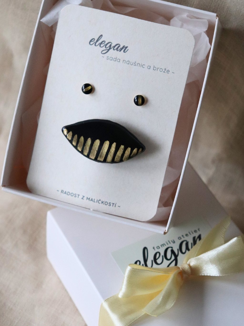 Šperkový set v černo-zlaté kombinaci, ve kterém najdete elegantní brož a vyladěné pecky.